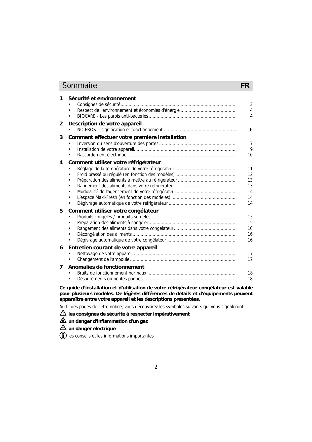 guide d'installation et d'utilisation de votre réfrigérateur-congélateur est valable pour plusieurs modèles. De légères différences de détails et d'équipements peuvent apparaître entre votre appareil et les descriptions présentées