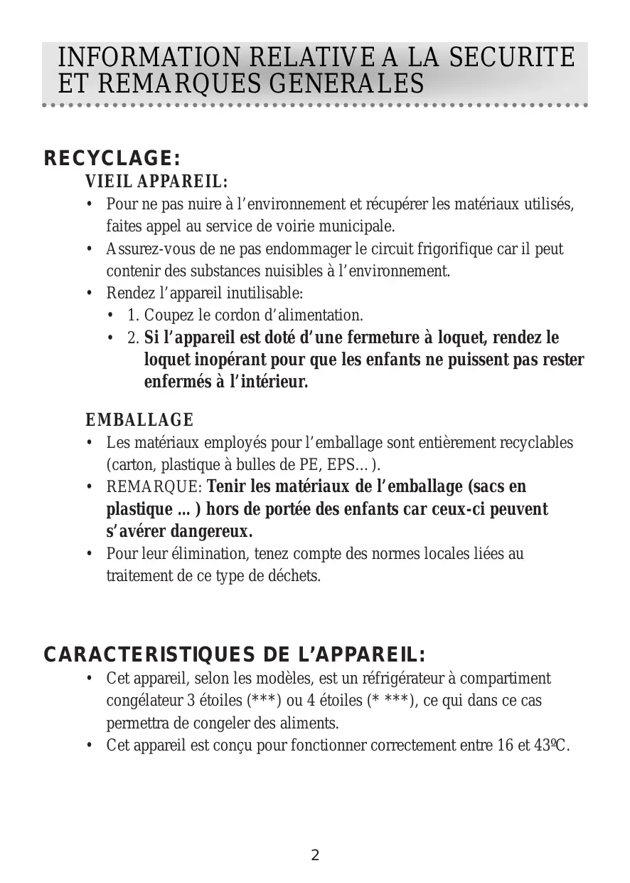 • Cet appareil, selon les modèles, est un réfrigérateur à compartiment congélateur 3 étoiles (***) ou 4 étoiles (* ***), ce qui dans ce cas permettra de congeler des aliments. • Cet appareil est conçu pour fonctionner correctement entre 16 et 43ºC.