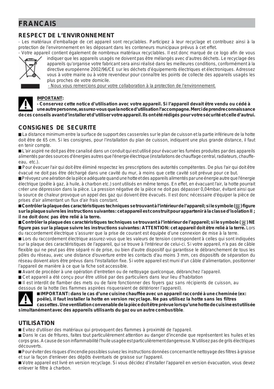 poêle), il faut installer la hotte en version recyclage. Ne pas utilisez la hotte sans les filtres cassettes. Une ventilation convenable de la pièce doitêtre prévue lorsqu'une hotte de cuisine estutilisée simultanémentavec des appareils utilisants du gaz ou un autre combustible.