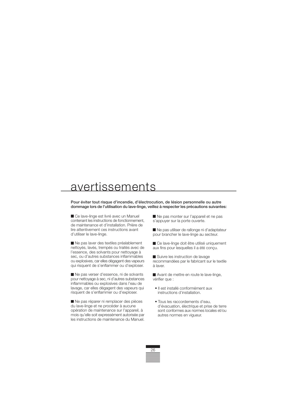 Ne pas laver des textiles préalablement nettoyés, lavés, trempés ou traités avec de l’essence, des solvants pour nettoyage à sec, ou d’autres substances inflammables ou explosives, car elles dégagent des vapeurs qui risquent de s’enflammer ou d’exploser.