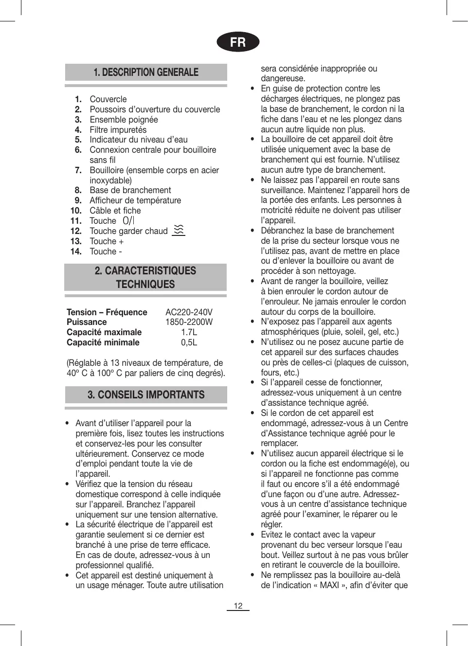 En guise de protection contre les décharges électriques, ne plongez pas la base de branchement, le cordon ni la fiche dans l’eau et ne les plongez dans aucun autre liquide non plus. La bouilloire de cet appareil doit être utilisée uniquement avec la base de branchement qui est fournie. N’utilisez aucun autre type de branchement. Ne laissez pas l’appareil en route sans surveillance. Maintenez l’appareil hors de la portée des enfants. Les personnes à motricité réduite ne doivent pas utiliser l’appareil. Débranchez la base de branchement de la prise du secteur lorsque vous ne l’utilisez pas, avant de mettre en place ou d’enlever la bouilloire ou avant de procéder à son nettoyage. Avant de ranger la bouilloire, veillez à bien enrouler le cordon autour de l’enrouleur. Ne jamais enrouler le cordon autour du corps de la bouilloire. N’exposez pas l’appareil aux agents atmosphériques (pluie, soleil, gel, etc.) N’utilisez ou ne posez aucune partie de cet appareil sur des surfaces chaudes ou près de celles-ci (plaques de cuisson, fours, etc.) Si l’appareil cesse de fonctionner, adressez-vous uniquement à un centre d’assistance technique agréé. Si le cordon de cet appareil est endommagé, adressez-vous à un Centre d’Assistance technique agréé pour le remplacer. N’utilisez aucun appareil électrique si le cordon ou la fiche est endommagé(e), ou si l’appareil ne fonctionne pas comme il faut ou encore s’il a été endommagé d’une façon ou d’une autre. Adressezvous à un centre d’assistance technique agréé pour l’examiner, le réparer ou le régler. Evitez le contact avec la vapeur provenant du bec verseur lorsque l’eau bout. Veillez surtout à ne pas vous brûler en retirant le couvercle de la bouilloire. Ne remplissez pas la bouilloire au-delà de l’indication « MAXI », afin d’éviter que