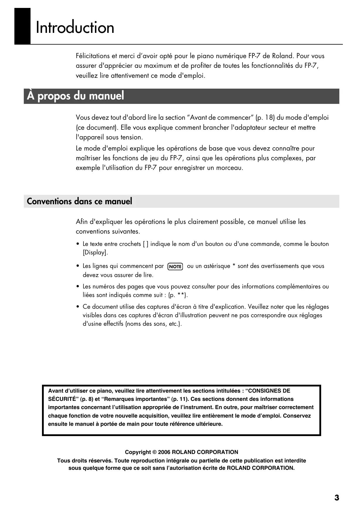 Introduction Félicitations et merci d’avoir opté pour le piano numérique FP-7 de Roland. Pour vous assurer d'apprécier au maximum et de profiter de toutes les fonctionnalités du FP-7, veuillez lire attentivement ce mode d'emploi. À propos du manuel Vous devez tout d'abord lire la section “Avant de commencer” (p. 18) du mode d'emploi (ce document). Elle vous explique comment brancher l'adaptateur secteur et mettre l'appareil sous tension. Le mode d'emploi explique les opérations de base que vous devez connaître pour maîtriser les fonctions de jeu du FP-7, ainsi que les opérations plus complexes, par exemple l'utilisation du FP-7 pour enregistrer un morceau. Conventions dans ce manuel Afin d'expliquer les opérations le plus clairement possible, ce manuel utilise les conventions suivantes.