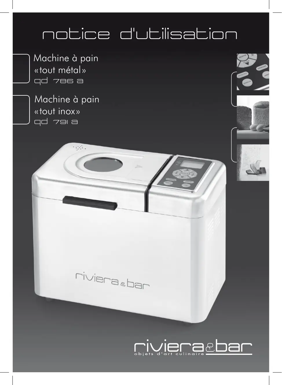 notice d'utilisation Machine à pain « tout métal » qd 786 a Document et visuels non contractuels - Caractéristiques susceptibles d’être modifiées. Machine à pain « tout inox » qd 791 a description du produit Avec cet appareil, vous avez fait l’acquisition d’un article de qualité, bénéficiant de toute l’expérience de Riviera & Bar dans le domaine de la cuisson. Il répond aux critères de qualité Riviera & Bar : les meilleurs matériaux et composants ont été utilisés pour sa fabrication, et il a été soumis à des contrôles rigoureux. Nous souhaitons que son usage vous apporte entière satisfaction. Nous vous demandons de lire très attentivement les instructions indiquées dans cette notice, car elles fournissent, entre autres, des informations importantes relatives à la sécurité d’installation, d’utilisation et d’entretien. Gardez votre notice, vous pourriez avoir besoin de vous y référer dans le futur. description du produit