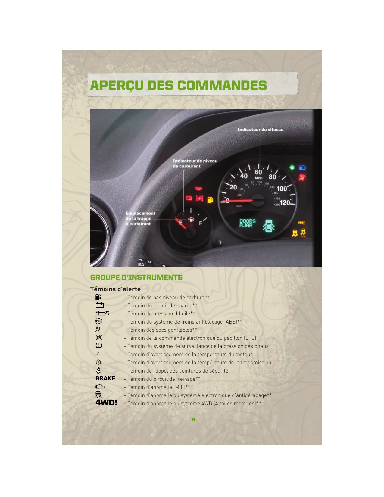 GROUPE D'INSTRUMENTS Témoins d’alerte - Témoin de bas niveau de carburant - Témoin du circuit de charge** - Témoin de pression d’huile** - Témoin du système de freins antiblocage (ABS)** - Témoin des sacs gonflables** - Témoin de la commande électronique du papillon (ETC) - Témoin du système de surveillance de la pression des pneus - Témoin d’avertissement de la température du moteur - Témoin d’avertissement de la température de la transmission - Témoin de rappel des ceintures de sécurité BRAKE - Témoin du circuit de freinage** - Témoin d’anomalie (MIL)** - Témoin d’anomalie du système électronique d’antidérapage** - Témoin d’anomalie du système 4WD (4 roues motrices)**