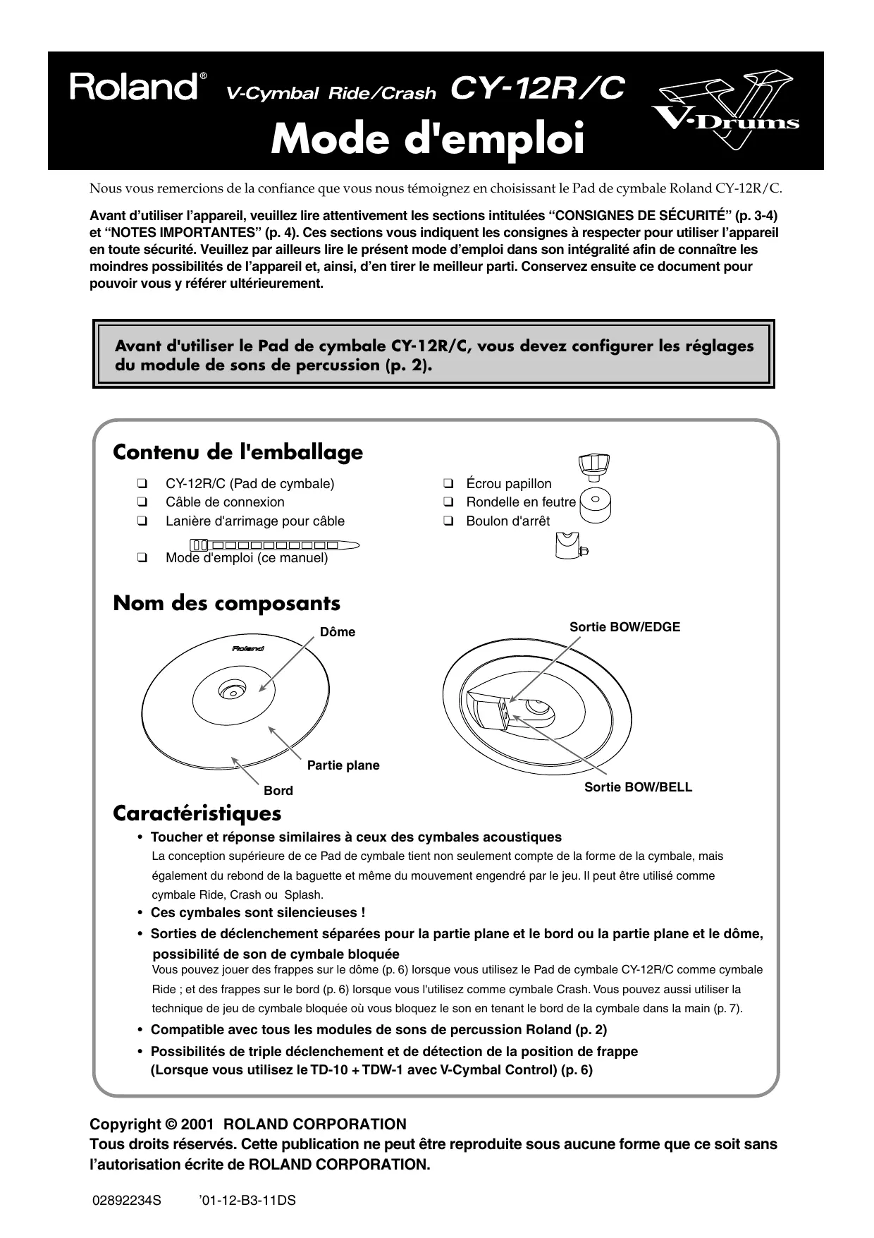 Nous vous remercions de la confiance que vous nous témoignez en choisissant le Pad de cymbale Roland CY-12R/C. Avant d’utiliser l’appareil, veuillez lire attentivement les sections intitulées “CONSIGNES DE SÉCURITÉ” (p. 3-4) et “NOTES IMPORTANTES” (p. 4). Ces sections vous indiquent les consignes à respecter pour utiliser l’appareil en toute sécurité. Veuillez par ailleurs lire le présent mode d’emploi dans son intégralité afin de connaître les moindres possibilités de l’appareil et, ainsi, d’en tirer le meilleur parti. Conservez ensuite ce document pour pouvoir vous y référer ultérieurement.