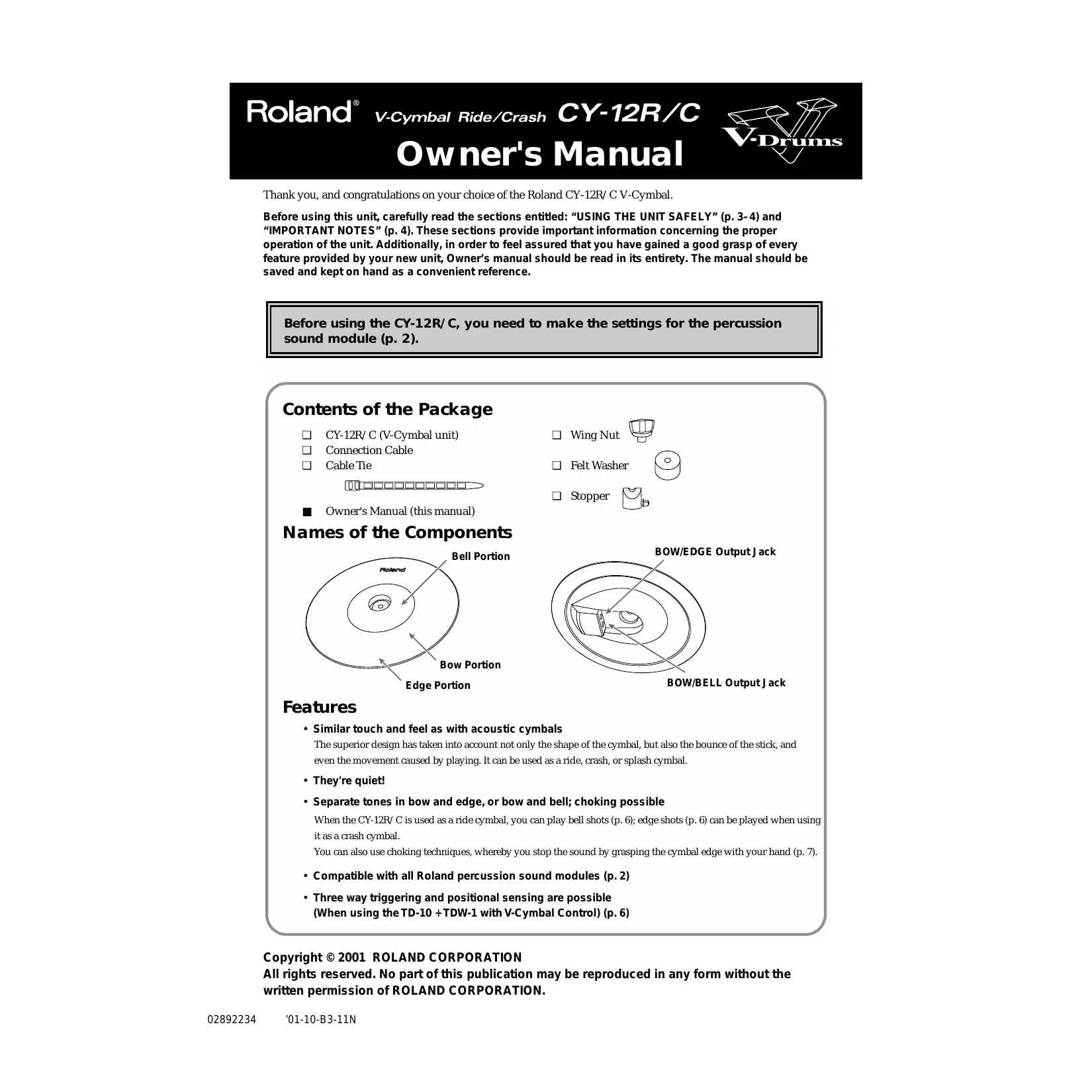 CY-12R - Pad électronique ROLAND - Notice d'utilisation et mode d'emploi gratuit