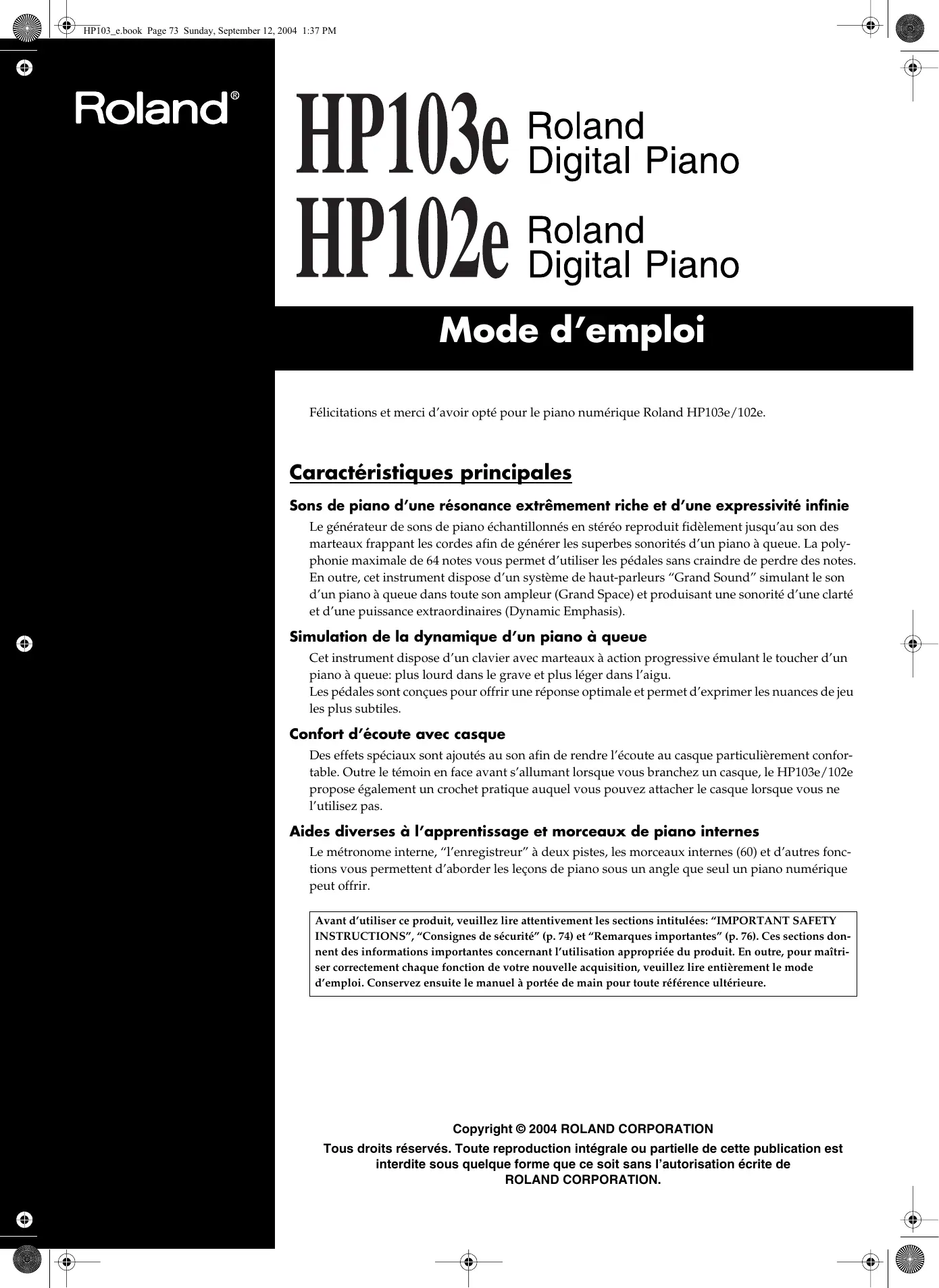 MODE D'EMPLOI HP-103E ROLAND