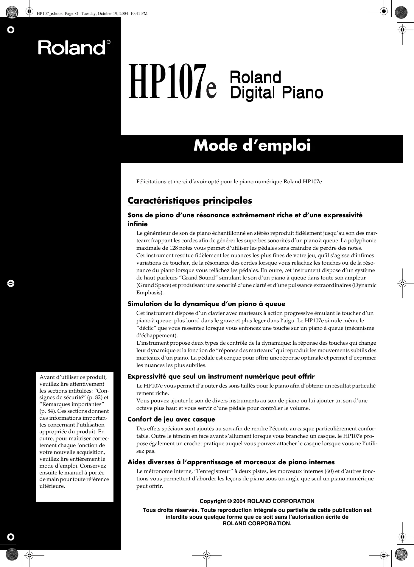 HP107_e.book Page 81 Tuesday, October 19, 2004 10:41 PM Mode d’emploi Félicitations et merci d’avoir opté pour le piano numérique Roland HP107e.