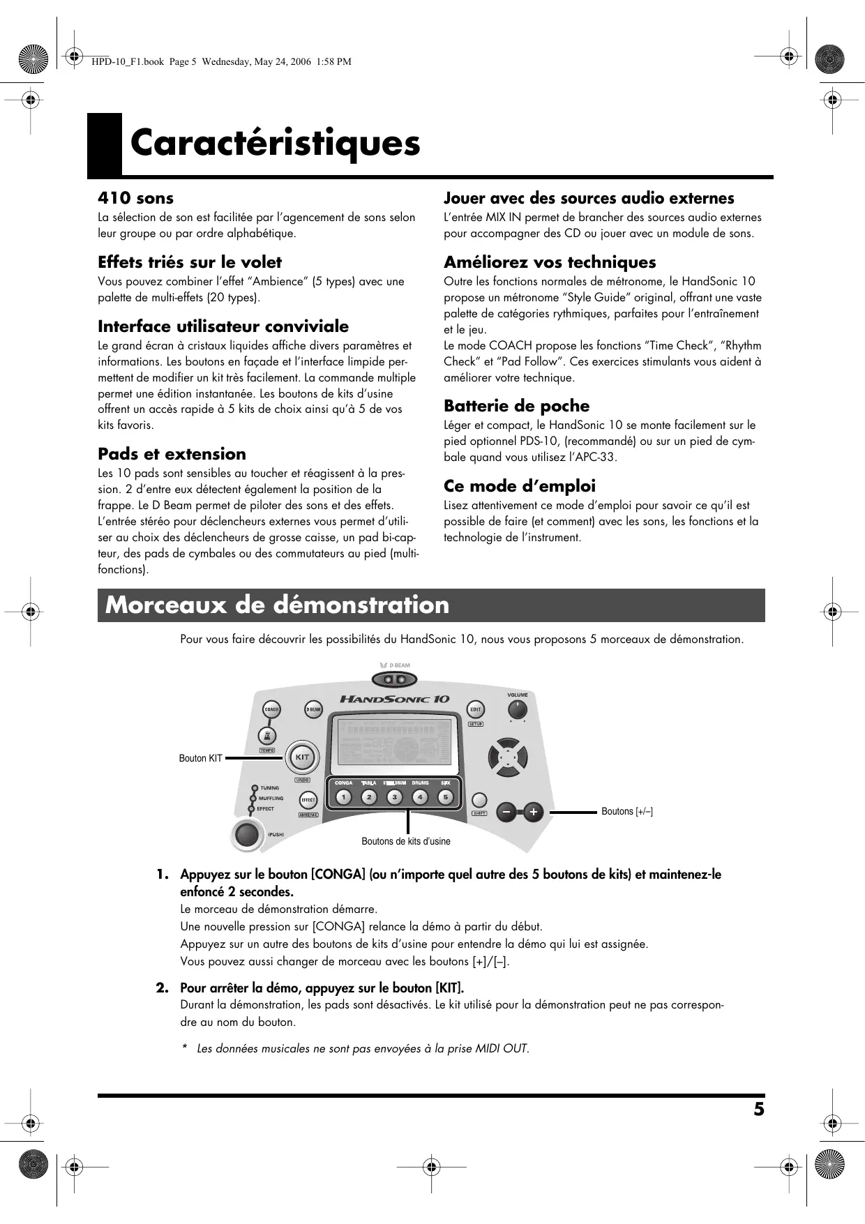 Copyright ©2006 ROLAND CORPORATION Tous droits réservés. Toute reproduction intégrale ou partielle de cette publication est interdite sous quelque forme que ce soit sans l’autorisation écrite de ROLAND CORPORATION. HPD-10_F1.book Page 5 Wednesday, May 24, 2006 1:58 PM Caractéristiques 410 sons Jouer avec des sources audio externes La sélection de son est facilitée par l’agencement de sons selon leur groupe ou par ordre alphabétique. L’entrée MIX IN permet de brancher des sources audio externes pour accompagner des CD ou jouer avec un module de sons. Effets triés sur le volet Améliorez vos techniques Vous pouvez combiner l’effet “Ambience” (5 types) avec une palette de multi-effets (20 types). Outre les fonctions normales de métronome, le HandSonic 10 propose un métronome “Style Guide” original, offrant une vaste palette de catégories rythmiques, parfaites pour l’entraînement et le jeu. Le mode COACH propose les fonctions “Time Check”, “Rhythm Check” et “Pad Follow”. Ces exercices stimulants vous aident à améliorer votre technique. Interface utilisateur conviviale Le grand écran à cristaux liquides affiche divers paramètres et informations. Les boutons en façade et l’interface limpide permettent de modifier un kit très facilement. La commande multiple permet une édition instantanée. Les boutons de kits d’usine offrent un accès rapide à 5 kits de choix ainsi qu’à 5 de vos kits favoris. Pads et extension Les 10 pads sont sensibles au toucher et réagissent à la pression. 2 d’entre eux détectent également la position de la frappe. Le D Beam permet de piloter des sons et des effets. L’entrée stéréo pour déclencheurs externes vous permet d’utiliser au choix des déclencheurs de grosse caisse, un pad bi-capteur, des pads de cymbales ou des commutateurs au pied (multifonctions). Batterie de poche Léger et compact, le HandSonic 10 se monte facilement sur le pied optionnel PDS-10, (recommandé) ou sur un pied de cymbale quand vous utilisez l’APC-33. Ce mode d’emploi Lisez attentivement ce mode d’emploi pour savoir ce qu’il est possible de faire (et comment) avec les sons, les fonctions et la technologie de l’instrument. Morceaux de démonstration Pour vous faire découvrir les possibilités du HandSonic 10, nous vous proposons 5 morceaux de démonstration. Bouton KIT Boutons [+/–] Boutons de kits d’usine