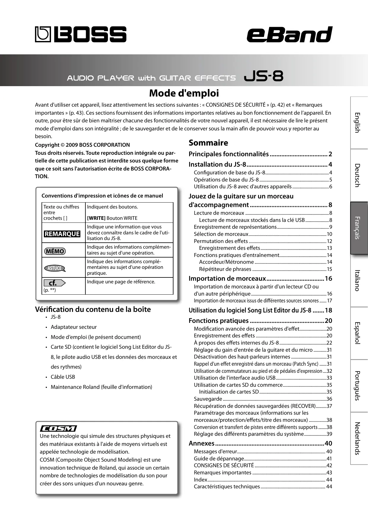 - Maintenance Roland (feuille d'information) Utilisation du logiciel Song List Editor du JS-8........18 Fonctions pratiques..............................................20 Modification avancée des paramètres d'effet.......................20 Enregistrement des effets.............................................................20 À propos des effets internes du JS-8.........................................22 Réglage du gain d'entrée de la guitare et du micro............31 Désactivation des haut-parleurs internes...............................31 Rappel d’un effet enregistré dans un morceau (Patch Sync).......31 Utilisation de commutateurs au pied et de pédales d'expression....32 Utilisation de l'interface audio USB............................................33 Utilisation de cartes SD du commerce......................................35 Initialisation de cartes SD..........................................................35 Sauvegarde.........................................................................................36 Récupération de données sauvegardées (RECOVER)..........37 Paramétrage des morceaux (informations sur les morceaux/protection/effets/titre des morceaux)................38 Conversion et transfert de pistes entre différents supports........38 Réglage des différents paramètres du système....................39 Une technologie qui simule des structures physiques et des matériaux existants à l'aide de moyens virtuels est appelée technologie de modélisation. COSM (Composite Object Sound Modeling) est une innovation technique de Roland, qui associe un certain nombre de technologies de modélisation du son pour créer des sons uniques d'un nouveau genre. Importation de morceaux à partir d'un lecteur CD ou d'un autre périphérique.................................................................16 Importation de morceaux issus de différentes sources sonores.......17 Português