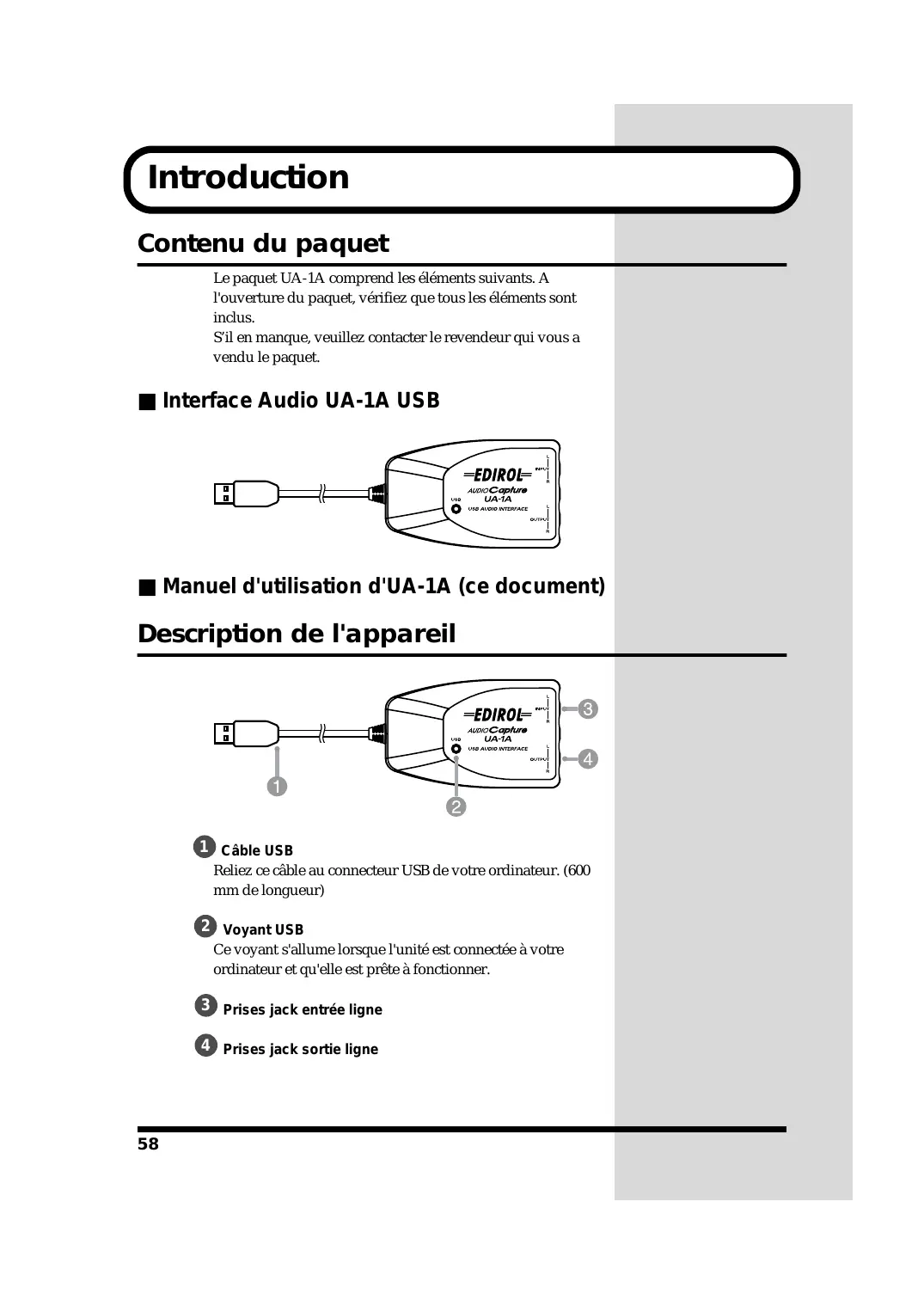 Maison FO - YAM Marcel FRANCE Roland France SA 4, Rue Paul Henri SPAAK, Parc de l'Esplanade, F 77 462 St. Thibault, Lagny Cedex FRANCE TEL: 01 600 73 500 Cet appareil numérique de la classe B respecte toutes les exigences du Règlement sur le matériel brouilleur du Canada. Introduction Contenu du paquet Le paquet UA-1A comprend les éléments suivants. A l'ouverture du paquet, vérifiez que tous les éléments sont inclus. S’il en manque, veuillez contacter le revendeur qui vous a vendu le paquet. ■ Manuel d'utilisation d'UA-1A (ce document) Description de l'appareil fig.UA1Afunc 1 Câble USB Reliez ce câble au connecteur USB de votre ordinateur. (600 mm de longueur) 2 Voyant USB Ce voyant s'allume lorsque l'unité est connectée à votre ordinateur et qu'elle est prête à fonctionner. 3 Prises jack entrée ligne 4 Prises jack sortie ligne