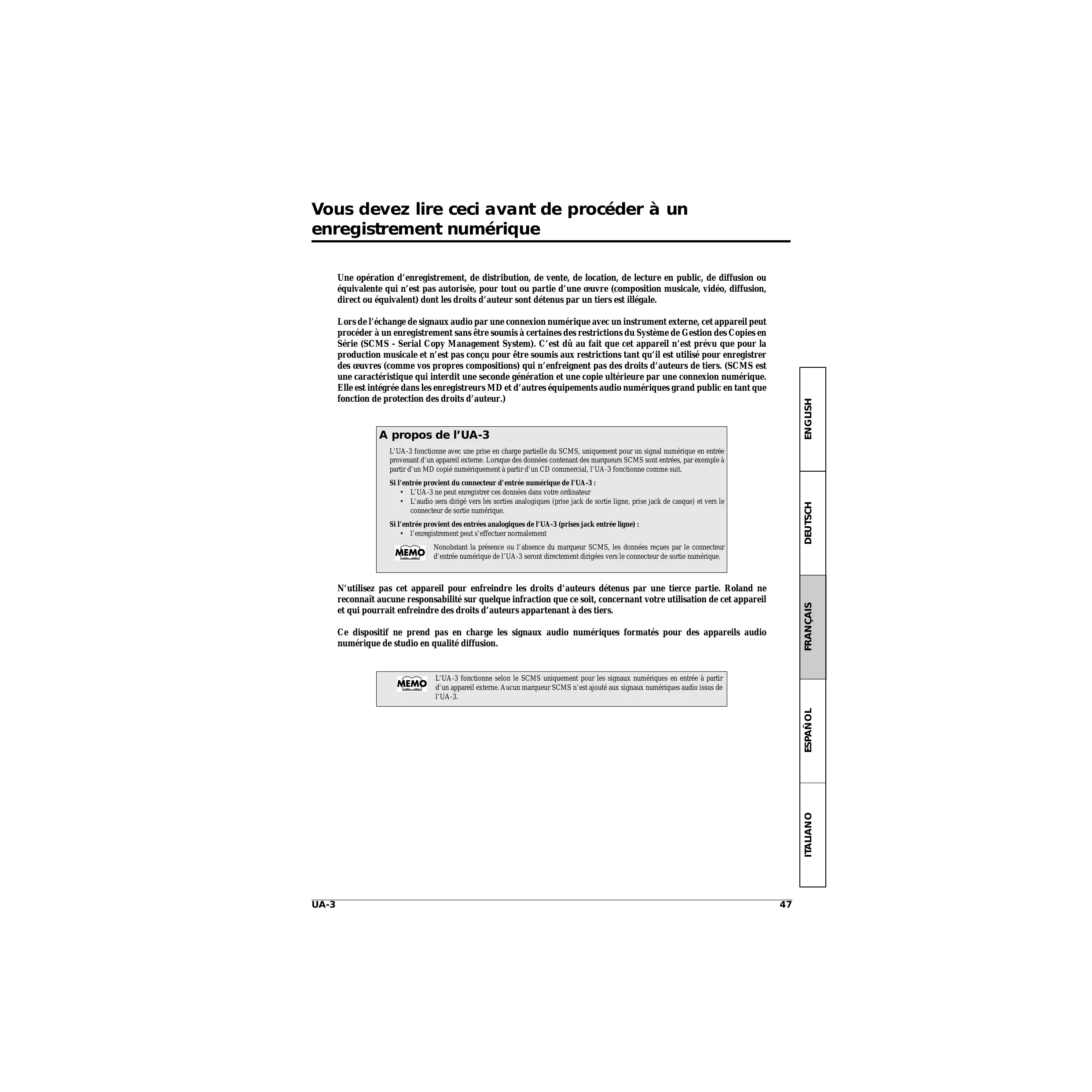 Vous devez lire ceci avant de procéder à un enregistrement numérique Une opération d’enregistrement, de distribution, de vente, de location, de lecture en public, de diffusion ou équivalente qui n’est pas autorisée, pour tout ou partie d’une œuvre (composition musicale, vidéo, diffusion, direct ou équivalent) dont les droits d’auteur sont détenus par un tiers est illégale. ENGLISH Lors de l’échange de signaux audio par une connexion numérique avec un instrument externe, cet appareil peut procéder à un enregistrement sans être soumis à certaines des restrictions du Système de Gestion des Copies en Série (SCMS - Serial Copy Management System). C’est dû au fait que cet appareil n’est prévu que pour la production musicale et n’est pas conçu pour être soumis aux restrictions tant qu’il est utilisé pour enregistrer des œuvres (comme vos propres compositions) qui n’enfreignent pas des droits d’auteurs de tiers. (SCMS est une caractéristique qui interdit une seconde génération et une copie ultérieure par une connexion numérique. Elle est intégrée dans les enregistreurs MD et d’autres équipements audio numériques grand public en tant que fonction de protection des droits d’auteur.) A propos de l’UA-3 L’UA-3 fonctionne avec une prise en charge partielle du SCMS, uniquement pour un signal numérique en entrée provenant d’un appareil externe. Lorsque des données contenant des marqueurs SCMS sont entrées, par exemple à partir d’un MD copié numériquement à partir d’un CD commercial, l’UA-3 fonctionne comme suit. DEUTSCH Si l’entrée provient du connecteur d’entrée numérique de l’UA-3 :