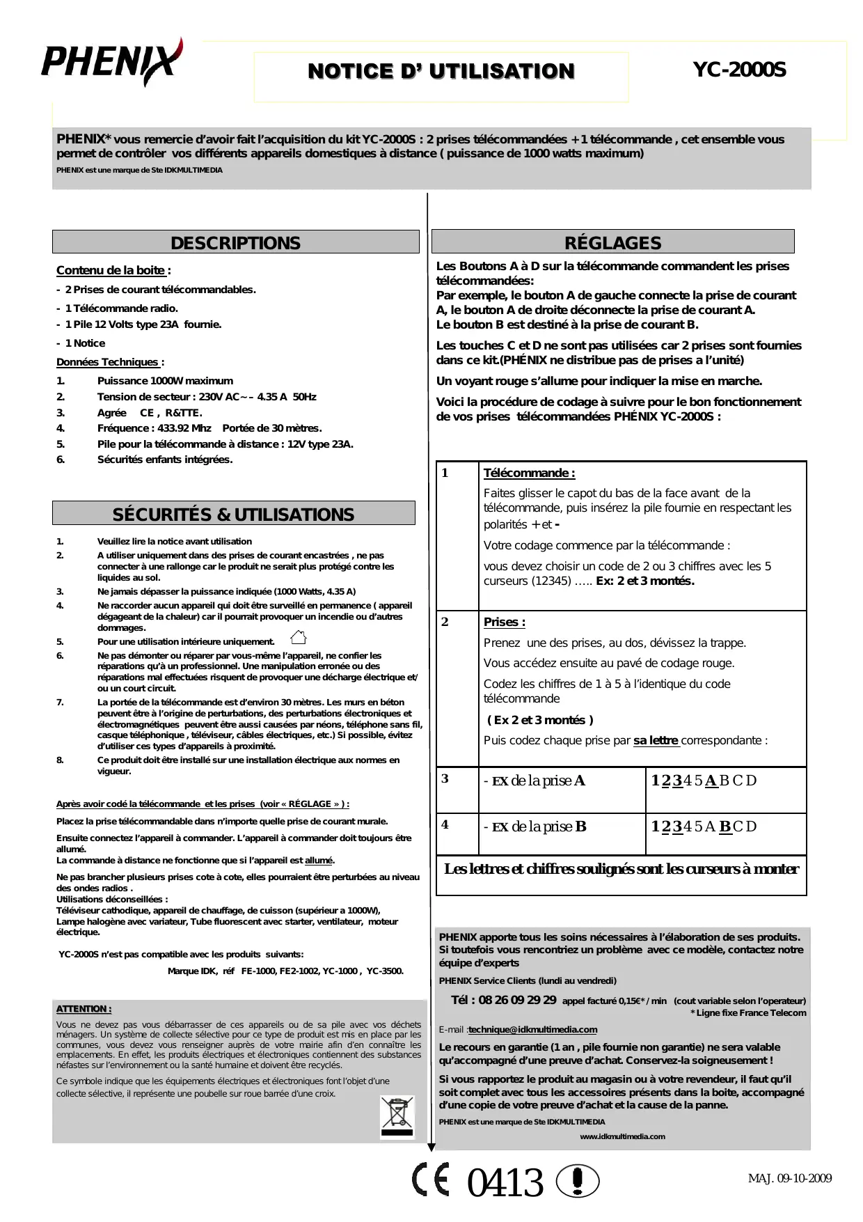 - EX de la prise B 12345ABCD Après avoir codé la télécommande et les prises (voir « RÉGLAGE » ) : Placez la prise télécommandable dans n’importe quelle prise de courant murale. Ensuite connectez l’appareil à commander. L’appareil à commander doit toujours être allumé. La commande à distance ne fonctionne que si l’appareil est allumé. Ne pas brancher plusieurs prises cote à cote, elles pourraient être perturbées au niveau des ondes radios . Utilisations déconseillées : Téléviseur cathodique, appareil de chauffage, de cuisson (supérieur a 1000W), Lampe halogène avec variateur, Tube fluorescent avec starter, ventilateur, moteur électrique. YC-2000S n’est pas compatible avec les produits suivants: Marque IDK, réf FE-1000, FE2-1002, YC-1000 , YC-3500. Les lettres et chiffres soulignés sont les curseurs à monter PHENIX apporte tous les soins nécessaires à l’élaboration de ses produits. Si toutefois vous rencontriez un problème avec ce modèle, contactez notre équipe d’experts PHENIX Service Clients (lundi au vendredi) ATTENTION : Vous ne devez pas vous débarrasser de ces appareils ou de sa pile avec vos déchets ménagers. Un système de collecte sélective pour ce type de produit est mis en place par les communes, vous devez vous renseigner auprès de votre mairie afin d’en connaître les emplacements. En effet, les produits électriques et électroniques contiennent des substances néfastes sur l’environnement ou la santé humaine et doivent être recyclés. Ce symbole indique que les équipements électriques et électroniques font l’objet d’une collecte sélective, il représente une poubelle sur roue barrée d’une croix. Tél : 08 26 09 29 29 appel facturé 0,15€* / min (cout variable selon l’operateur)
