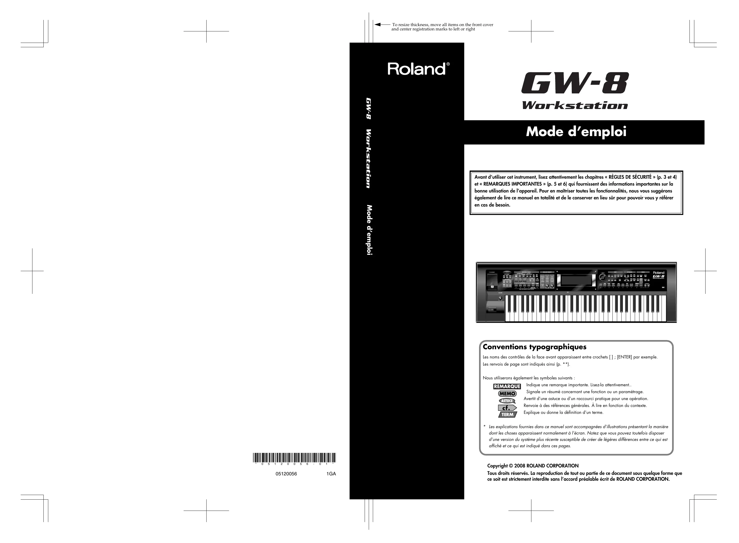 1GA Copyright © 2008 ROLAND CORPORATION Tous droits réservés. La reproduction de tout ou partie de ce document sous quelque forme que ce soit est strictement interdite sans l’accord préalable écrit de ROLAND CORPORATION. To resize thickness, move all items on the front cover and center registration marks to left or right. Pour les pays de la Communauté européenne Cet appareil est conforme aux directives européennes EMC 2004/108/EC. Pour les États-Unis COMMISSION FÉDÉRALE DES COMMUNICATIONS (FCC)