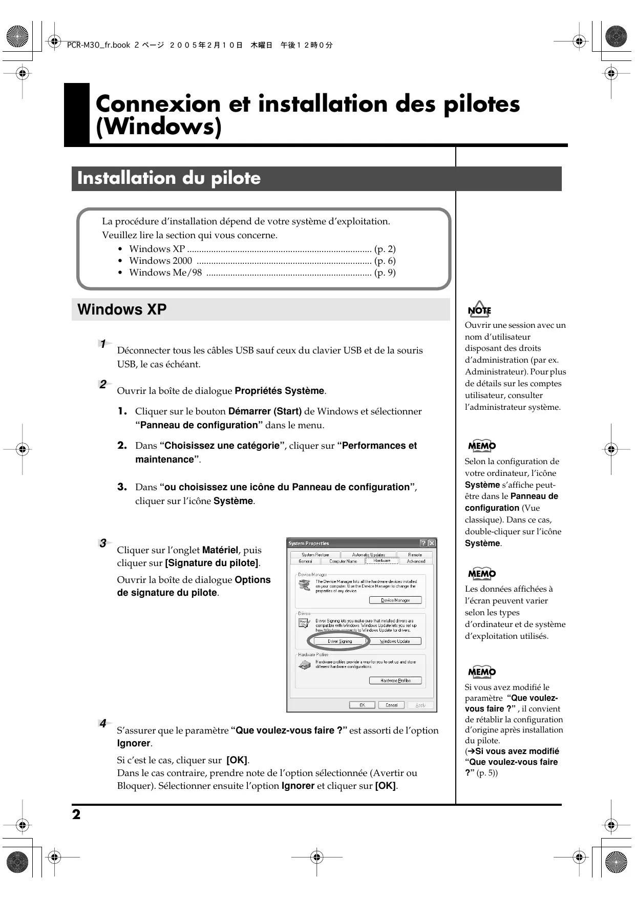 Si vous avez modifié le paramètre “Vérification de la signature du fichier”, vous devrez le rétablir suivant l’option choisie après avoir installé le pilote. (→“Si vous avez modifié l’option “Vérification de la signature des fichiers”” (p. 8)) PCR-M30_fr.book 7 ページ 2005年2月10日