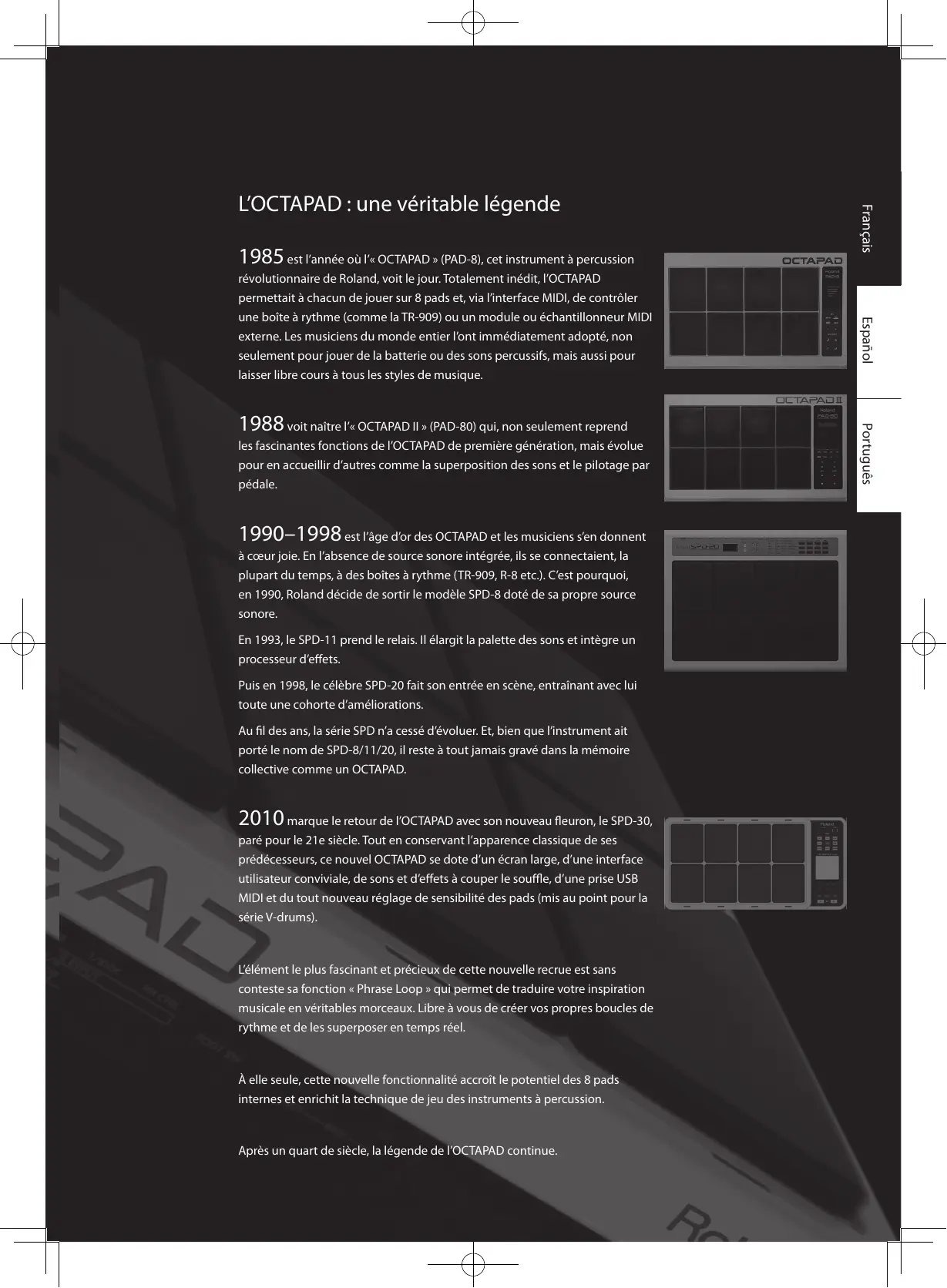 marque le retour de l’OCTAPAD avec son nouveau fleuron, le SPD-30, paré pour le 21e siècle . Tout en conservant l’apparence classique de ses prédécesseurs, ce nouvel OCTAPAD se dote d’un écran large, d’une interface utilisateur conviviale, de sons et d’effets à couper le souffle, d’une prise USB MIDI et du tout nouveau réglage de sensibilité des pads (mis au point pour la série V-drums) . L’élément le plus fascinant et précieux de cette nouvelle recrue est sans conteste sa fonction « Phrase Loop » qui permet de traduire votre inspiration musicale en véritables morceaux . Libre à vous de créer vos propres boucles de rythme et de les superposer en temps réel . À elle seule, cette nouvelle fonctionnalité accroît le potentiel des 8 pads internes et enrichit la technique de jeu des instruments à percussion . Après un quart de siècle, la légende de l’OCTAPAD continue . Português