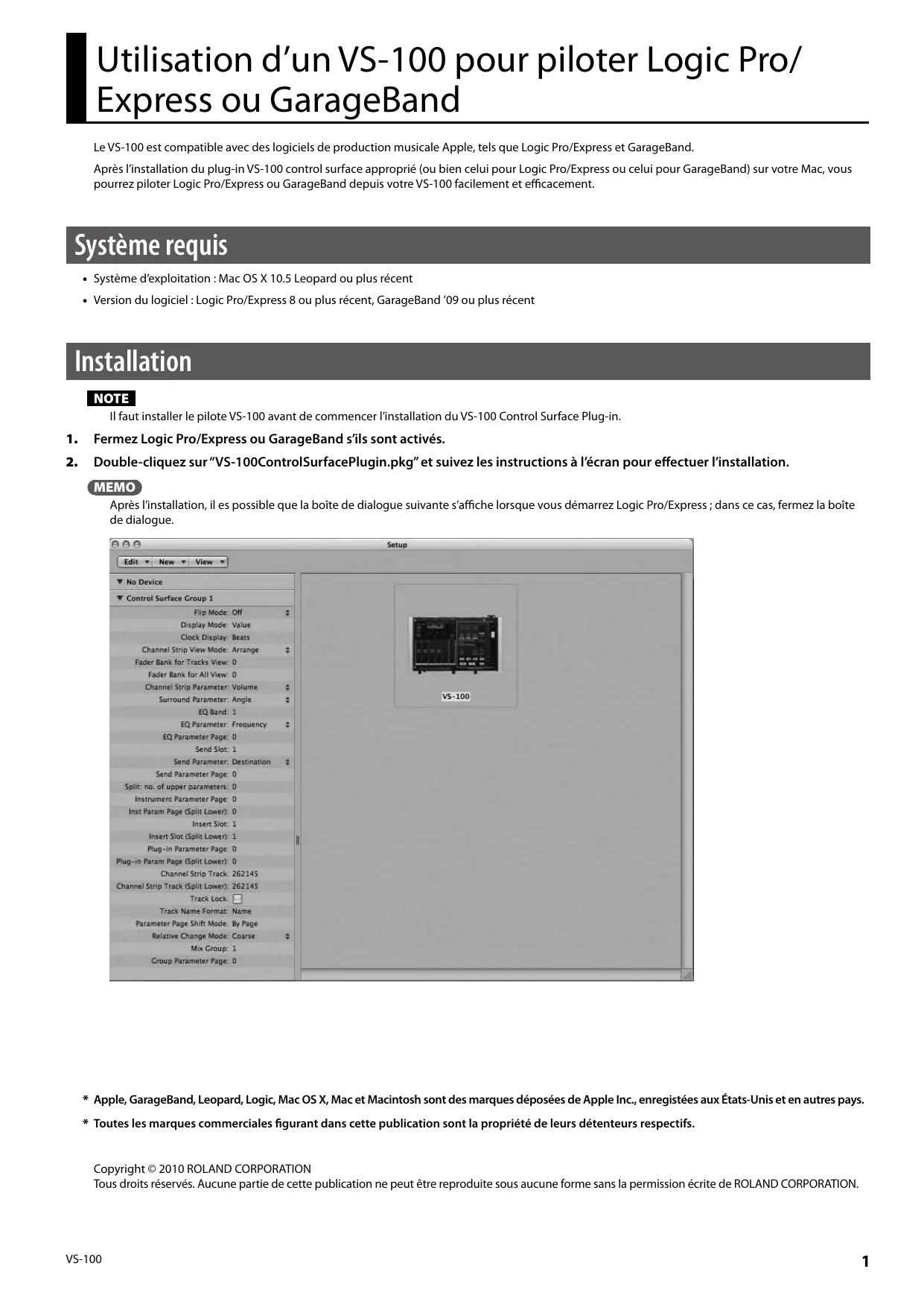* Toutes les marques commerciales figurant dans cette publication sont la propriété de leurs détenteurs respectifs. Copyright © 2010 ROLAND CORPORATION Tous droits réservés. Aucune partie de cette publication ne peut être reproduite sous aucune forme sans la permission écrite de ROLAND CORPORATION.