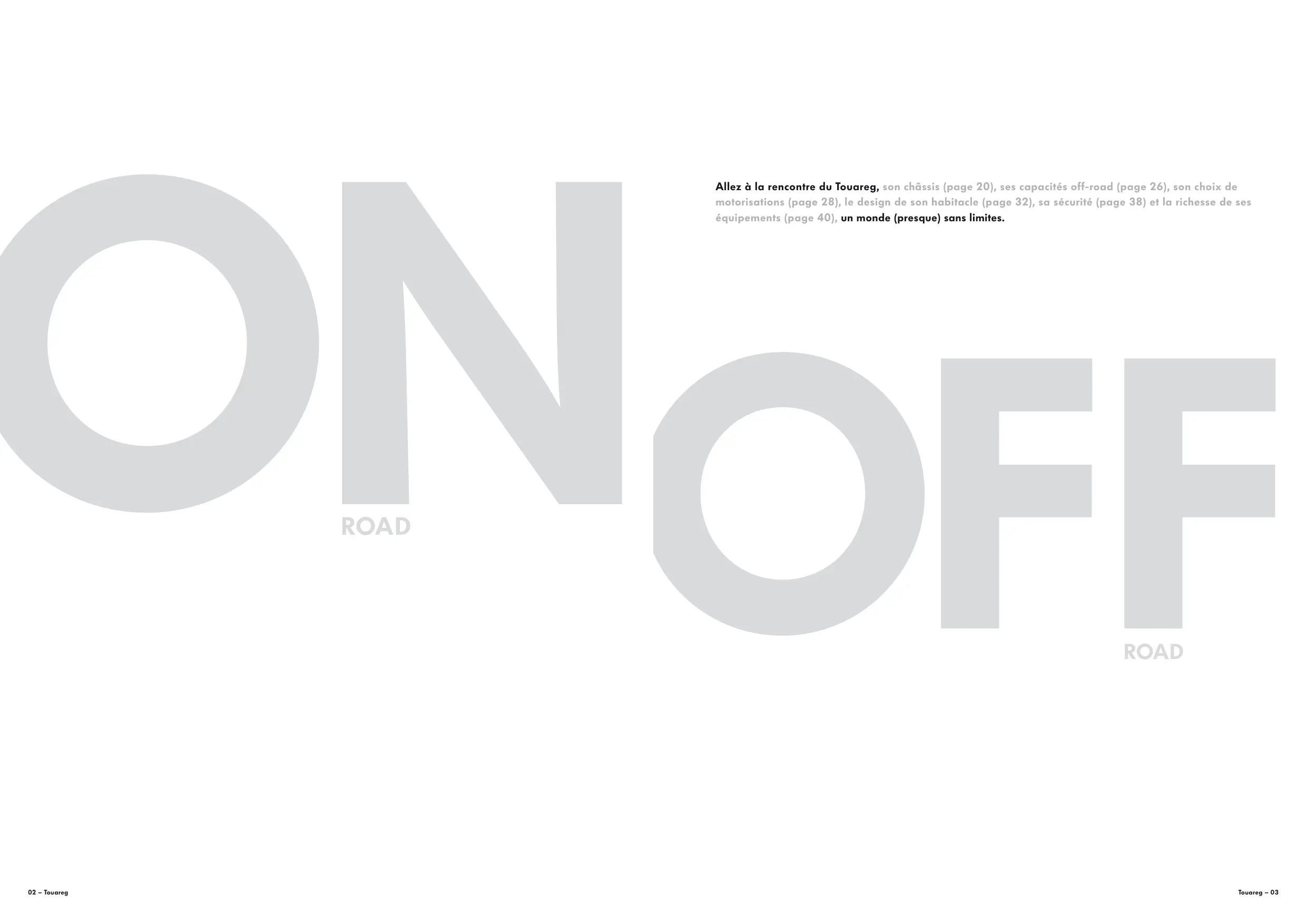 Das Auto.* Touareg *La Voiture. ONOFF Allez à la rencontre du Touareg, son châssis (page 20), ses capacités off-road (page 26), son choix de motorisations (page 28), le design de son habitacle (page 32), sa sécurité (page 38) et la richesse de ses équipements (page 40), un monde (presque) sans limites. ROAD ROAD 02 – Touareg Touareg – 03 Départ Arrivée Touareg – 05 Les contraintes de la ville. Les limites de la civilisation. Vous êtes au-delà de tout cela. Modèle présenté : Touareg Edition V10 TDI avec option barres de toit transversales anodisées, amovibles avec verrouillage à clé. Touareg – 07 Modèle présenté : Touareg V6 TDI avec options jantes en alliage léger “Makalu” - reflet d’argent métallisé - rampes de pavillon longitudinales noires - aide au stationnement avant et arrière - projecteurs Bi-Xénon - projecteurs antibrouillard - roue de secours normale sur le hayon arrière - toit ouvrant entrebâillant électrique avec velum. Touareg – 09 Directement Grand Canyon à la 5ème Avenue. 10 – Touareg Modèle présenté : Touareg V6 TDI avec options jantes en alliage léger “Makalu” - reflet d’argent métallisé - rampes de pavillon longitudinales noires - aide au stationnement avant et arrière - projecteurs Bi-Xénon - projecteurs antibrouillard - roue de secours normale sur le hayon arrière - toit ouvrant entrebâillant électrique avec velum. Modèle présenté : Touareg Edition V10 TDI avec option barres de toit transversales anodisées, amovibles avec verrouillage à clé. Touareg – 13 Routes de montagnes et autoroutes, plus de points communsque vous ne le pensez. Modèle présenté : Touareg Edition V10 TDI avec options jantes en alliage léger “Ayers Rock” - rampes de pavillion longitudinales anodisées - suppression de l’identification. Touareg – 15 Modèle présenté : Touareg V6 TDI avec options jantes en alliage léger “Makalu” - reflet d’argent métallisé - rampes de pavillon longitudinales noires - aide au stationnement avant et arrière - projecteurs Bi-Xénon - projecteurs antibrouillard - roue de secours normale sur le hayon arrière - toit ouvrant entrebâillant électrique avec velum. Touareg – 17 MOTION 18 – Touareg Touareg – 19 Sur l’autoroute. Avoir les reins solides, n’empêche pas d’avoir bon dos. La nouvelle technologie En montagne. des doubles bras Lorsque vous tournez vers la transversaux qui équipent droite le bouton de réglage de les essieux vous assure la hauteur, la suspension une précision et un pneumatique vous permet de confort de conduite digne faire varier graduellement la d’une berline haut de hauteur du Touareg sur une gamme. plage de 140 mm, offrant ainsi une garde au sol maximale de 300 mm pour le tout-terrain extrême. Le châssis du Touareg. La complexité de sa conception lui permet de maîtriser les revêtements et les environnements les plus différents, pour faire face à tous les défis aux quatre coins du globe. Dans les virages. Entre l’autoroute et le Mont Blanc. Le revêtement des voies de Le potentiel des différentes circulation donnera motorisations est transmis de l’occasion à la suspension manière contrôlée grâce à une pneumatique d’exprimer ses boîte Tiptronic à six rapports. Un qualités dynamiques, puisque programme de gestion le réglage électronique des dynamique (DSP) identifie votre amortisseurs intègre un style de conduite et adapte mode surbaissé pour la intelligemment le passage des conduite rapide. Ceci vitesses. entraîne une réduction de la résistance au vent et une baisse de la consommation, et également une meilleure tenue de route. La compensation de roulis à régulation manuelle ou automatique vient compléter ces éléments de conduite dynamique en améliorant le comportement en virage. Dans les éboulis. En ville. Neige ou verglas. La transmission intégrale permanente La direction Servotronic régule Une boîte de transfert avec 4XMOTION contrôle électroniquement la l’assistance au niveau du gamme courte assure des répartition du couple moteur entre volant en fonction de la vitesse. performances de conduite l’essieu avant et arrière, voire même Cela signifie un minimum optimales dans toutes les individuellement sur chaque roue en cas d’efforts pour manœuvrer ou situations. En position “Low” de besoin. Si nécessaire, cette répartition faire un créneau. la puissance du moteur est de la force motrice peut être corrigée démultipliée d’une manière plusieurs fois, automatiquement, en une précise pour permettre une seconde. motricité efficace sur sol glissant ou en tout-terrain. Touareg – 21 Un confort élevé même sur chaussée déformée. Un meilleur contact avec le sol. Passage de gué et garde au sol impressionnants. Comportement de conduite sportif et dynamique. Grâce à la position “Confort” du réglage des Les deux systèmes électroniques de blocage Réglez le sélecteur en butée, et la suspension Sur le bitume, la tenue de route et le amortisseurs, nids de poule et crevasses du des différentiels du Touareg assurent en pneumatique ajustera la hauteur de caisse du comportement sportif des amortisseurs jouent revêtement ne seront plus qu’un lointain permanence des conditions optimales de Touareg au niveau maximal. Le franchissement un rôle essentiel. Rien de plus simple pour le souvenir. Dans ce cas, la régulation traction sur les sols meubles ou glissants. de gués, d’une profondeur pouvant atteindre Touareg. D’un simple clic, la suspension électronique des amortisseurs, couplée aux En fonction de la situation, il est possible 58 cm ou un angle d’attaque de 33°, n’est plus un devient plus rigide ; en outre le châssis capteurs, absorbe les irrégularités de la de transférer jusqu’à 100 % de la force problème. s’abaisse automatiquement, entraînant une chaussée, même importantes. d’entraînement sur la roue ayant la meilleure réduction de la ha