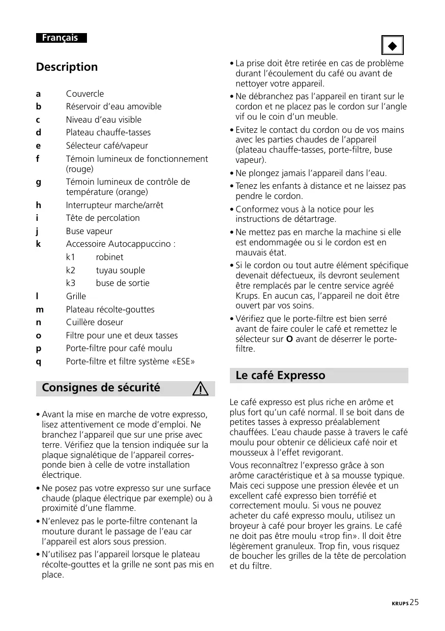 - Si le cordon ou tout autre élément spécifique devenait défectueux, ils devront seulement être remplacés par le centre service agréé Krups. En aucun cas, l’appareil ne doit être ouvert par vos soins.