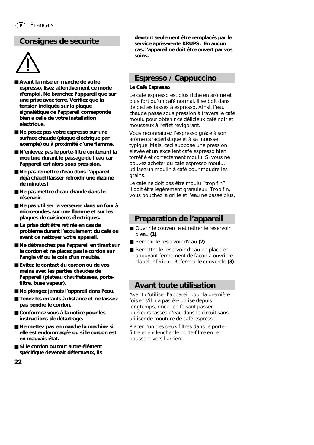 Français Consignes de securite ■ Avant la mise en marche de votre espresso, lisez attentivement ce mode d’emploi. Ne branchez l’appareil que sur une prise avec terre. Vérifiez que la tension indiquée sur la plaque signalétique de l’appareil corresponde bien à celle de votre installation électrique. ■ Ne posez pas votre espresso sur une surface chaude (plaque électrique par exemple) ou à proximité d’une flamme. ■ N’enlevez pas le porte-filtre contenant la mouture durant le passage de l’eau car l’appareil est alors sous pres-sion. ■ Ne pas remettre d’eau dans l’appareil déjà chaud (laisser refroidir une dizaine de minutes) ■ Ne pas mettre d’eau chaude dans le réservoir. ■ Ne pas utiliser la verseuse dans un four à micro-ondes, sur une flamme et sur les plaques de cuisinères électriques. ■ La prise doit être retirée en cas de probleme durant l’écoulement du café ou avant de nettoyer votre appareil. ■ Ne débranchez pas l’appareil en tirant sur le cordon et ne placez pas le cordon sur l’angle vif ou le coin d’un meuble. ■ Evitez le contact du cordon ou de vos mains avec les parties chaudes de l’appareil (plateau chauffetasses, portefiltre, buse vapeur). ■ Ne plongez jamais l’appareil dans l’eau. devront seulement être remplacés par le service après-vente KRUPS. En aucun cas, l’appareil ne doit être ouvert par vos soins. Espresso / Cappuccino Le Café Espresso Le café espresso est plus riche en arôme et plus fort qu’un café normal. Il se boit dans de petites tasses à espresso. Ainsi, l’eau chaude passe sous pression à travers le café moulu pour obtenir ce délicieux café noir et mousseux à l’effet revigorant. Vous reconnaîtrez l’espresso grâce à son arôme caractéristique et à sa mousse typique. Mais, ceci suppose une pression élevée et un excellent café espresso bien torréfié et correctement moulu. Si vous ne pouvez acheter du café espresso moulu, utilisez un moulin à café pour moudre les grains. Le café ne doit pas être moulu “trop fin”. Il doit être légèrement granuleux. Trop fin, vous bouchez la grille et l’eau ne passe plus. Preparation de l’appareil ■ Ouvrir le couvercle et retirer le réservoir d'eau (1). ■ Remplir le réservoir d'eau (2). ■ Remettre le réservoir d'eau en place en appuyant fermement de façon à ouvrir le clapet inférieur. Refermer le couvercle (3). Avant toute utilisation ■ Conformez vous à la notice pour les instructions de détartrage. Avant d'utiliser l'appareil pour la première fois et s'il n'a pas été utilisé depuis longtemps, rincer en faisant passer plusieurs tasses d'eau dans le circuit sans utiliser de mouture de café espresso. ■ Ne mettez pas en marche la machine si elle est endommagée ou si le cordon est en mauvais état. Placer l'un des deux filtres dans le portefiltre et enclencher le porte-filtre en le poussant vers l'arrière. ■ Tenez les enfants à distance et ne laissez pas pendre le cordon. ■ Si le cordon ou tout autre élément spécifique devenait défectueux, ils