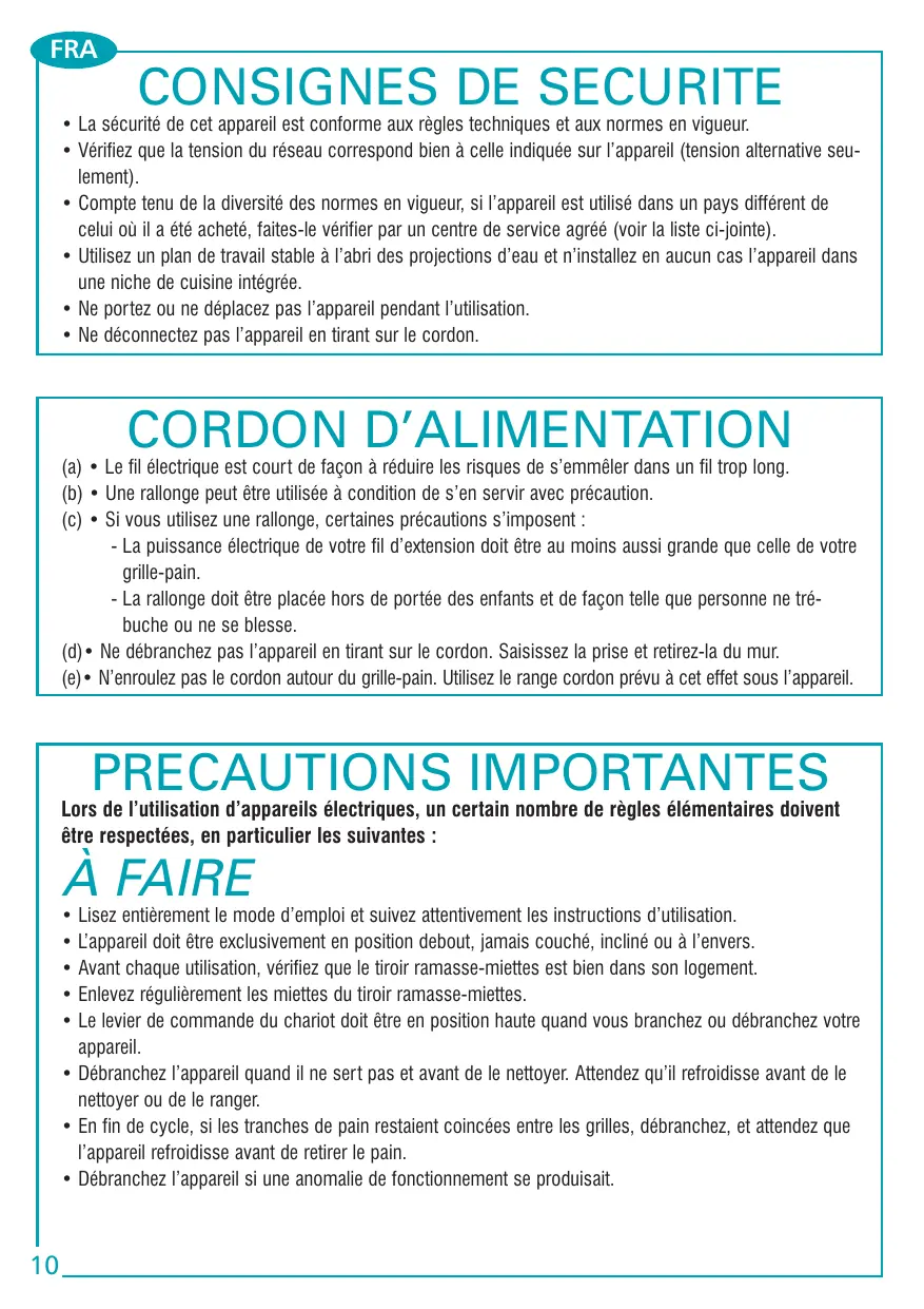 (a) • Le fil électrique est court de façon à réduire les risques de s’emmêler dans un fil trop long. (b) • Une rallonge peut être utilisée à condition de s’en servir avec précaution. (c) • Si vous utilisez une rallonge, certaines précautions s’imposent : - La puissance électrique de votre fil d’extension doit être au moins aussi grande que celle de votre grille-pain. - La rallonge doit être placée hors de portée des enfants et de façon telle que personne ne trébuche ou ne se blesse. (d)• Ne débranchez pas l’appareil en tirant sur le cordon. Saisissez la prise et retirez-la du mur. (e)• N’enroulez pas le cordon autour du grille-pain. Utilisez le range cordon prévu à cet effet sous l’appareil. PRECAUTIONS IMPORTANTES Lors de l’utilisation d’appareils électriques, un certain nombre de règles élémentaires doivent être respectées, en particulier les suivantes : À FAIRE