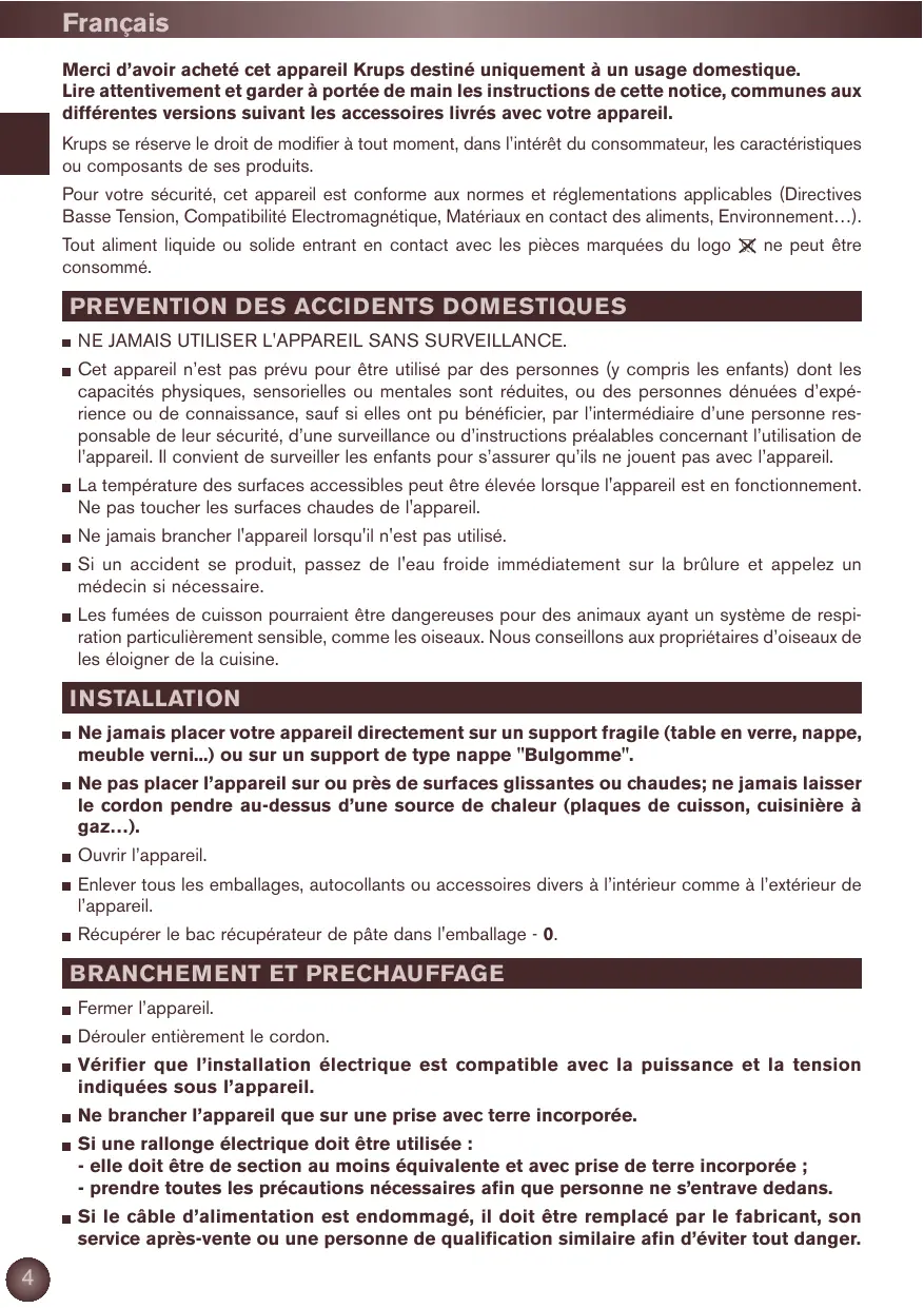 NE JAMAIS UTILISER L'APPAREIL SANS SURVEILLANCE. Cet appareil n’est pas prévu pour être utilisé par des personnes (y compris les enfants) dont les capacités physiques, sensorielles ou mentales sont réduites, ou des personnes dénuées d’expérience ou de connaissance, sauf si elles ont pu bénéficier, par l’intermédiaire d’une personne responsable de leur sécurité, d’une surveillance ou d’instructions préalables concernant l’utilisation de l’appareil. Il convient de surveiller les enfants pour s’assurer qu’ils ne jouent pas avec l’appareil. La température des surfaces accessibles peut être élevée lorsque l'appareil est en fonctionnement. Ne pas toucher les surfaces chaudes de l'appareil. Ne jamais brancher l'appareil lorsqu'il n'est pas utilisé. Si un accident se produit, passez de l'eau froide immédiatement sur la brûlure et appelez un médecin si nécessaire. Les fumées de cuisson pourraient être dangereuses pour des animaux ayant un système de respiration particulièrement sensible, comme les oiseaux. Nous conseillons aux propriétaires d’oiseaux de les éloigner de la cuisine. INSTALLATION Ne jamais placer votre appareil directement sur un support fragile (table en verre, nappe, meuble verni...) ou sur un support de type nappe "Bulgomme". Ne pas placer l’appareil sur ou près de surfaces glissantes ou chaudes; ne jamais laisser le cordon pendre au-dessus d’une source de chaleur (plaques de cuisson, cuisinière à gaz…). Ouvrir l’appareil. Enlever tous les emballages, autocollants ou accessoires divers à l’intérieur comme à l’extérieur de l’appareil. Récupérer le bac récupérateur de pâte dans l'emballage - 0.