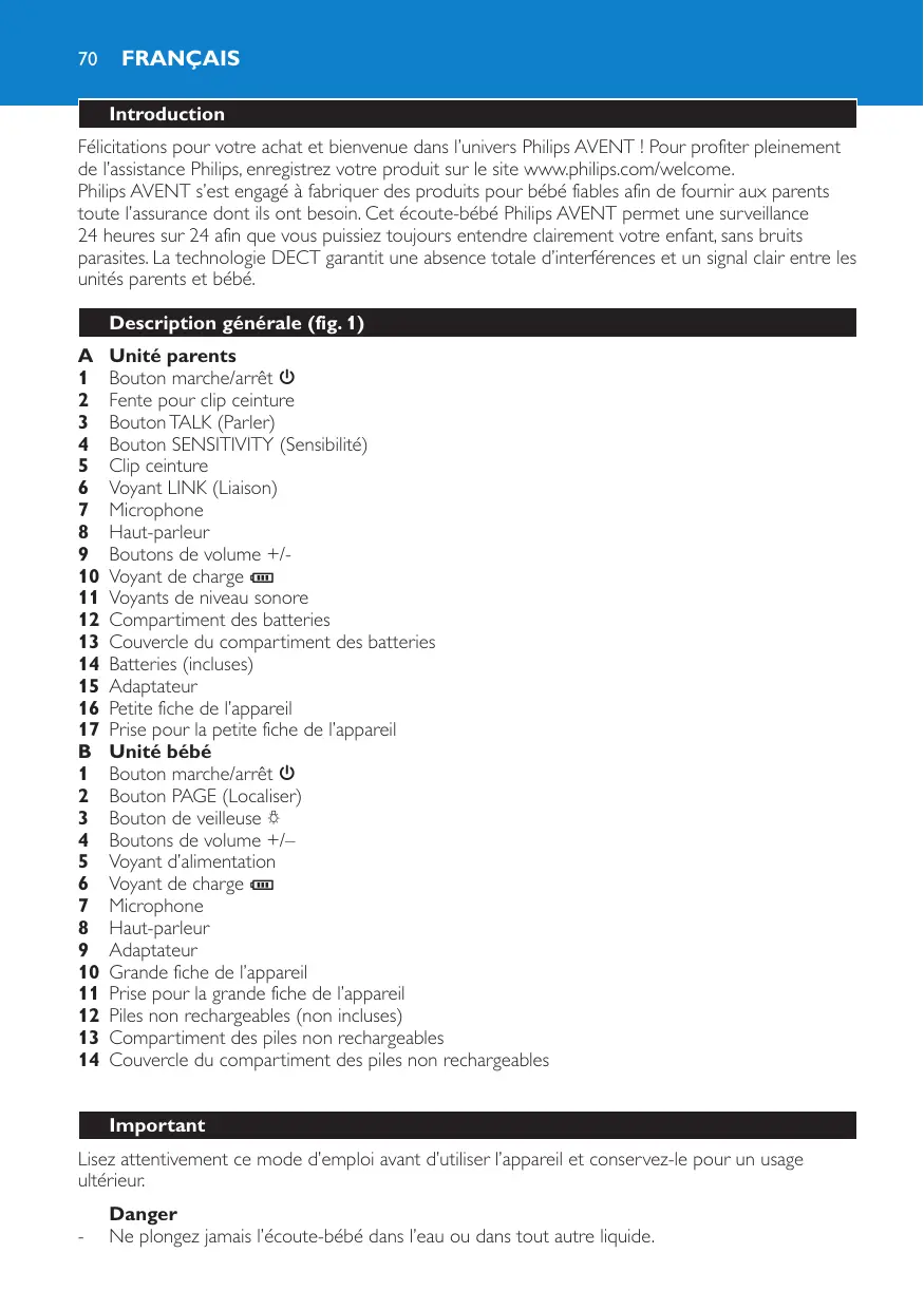 Félicitations pour votre achat et bienvenue dans l’univers Philips AVENT ! Pour profiter pleinement de l’assistance Philips, enregistrez votre produit sur le site www.philips.com/welcome. Philips AVENT s’est engagé à fabriquer des produits pour bébé fiables afin de fournir aux parents toute l’assurance dont ils ont besoin. Cet écoute-bébé Philips AVENT permet une surveillance 24 heures sur 24 afin que vous puissiez toujours entendre clairement votre enfant, sans bruits parasites. La technologie DECT garantit une absence totale d’interférences et un signal clair entre les unités parents et bébé. Description générale (fig. 1)