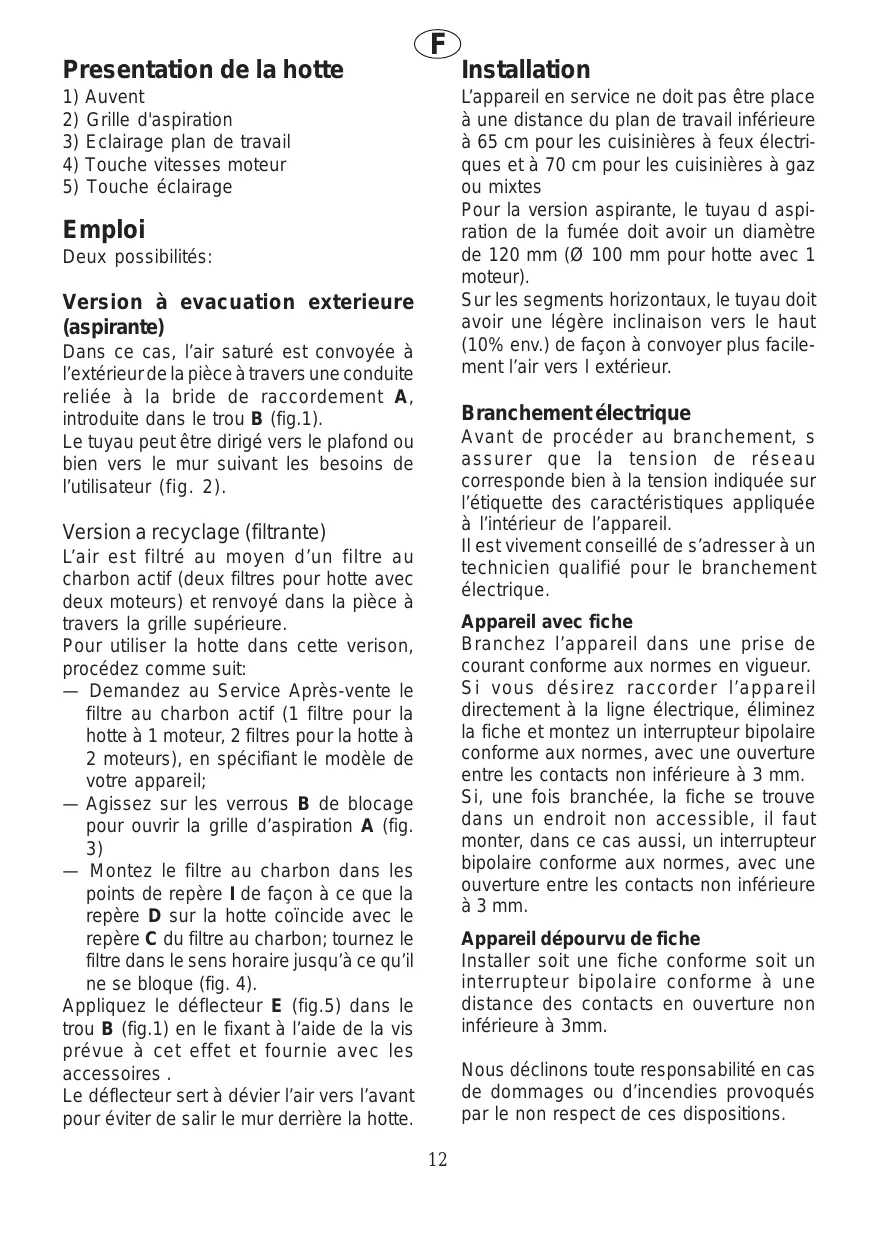 L’appareil en service ne doit pas être place à une distance du plan de travail inférieure à 65 cm pour les cuisinières à feux électriques et à 70 cm pour les cuisinières à gaz ou mixtes Pour la version aspirante, le tuyau d aspiration de la fumée doit avoir un diamètre de 120 mm (Ø 100 mm pour hotte avec 1 moteur). Sur les segments horizontaux, le tuyau doit avoir une légère inclinaison vers le haut (10% env.) de façon à convoyer plus facilement l’air vers l extérieur. Auvent Grille d'aspiration Eclairage plan de travail Touche vitesses moteur Touche éclairage Emploi Deux possibilités: Version à evacuation exterieure (aspirante) Dans ce cas, l’air saturé est convoyée à l’extérieur de la pièce à travers une conduite reliée à la bride de raccordement A, introduite dans le trou B (fig.1). Le tuyau peut être dirigé vers le plafond ou bien vers le mur suivant les besoins de l’utilisateur (fig. 2). Branchement électrique Avant de procéder au branchement, s assurer que la tension de réseau corresponde bien à la tension indiquée sur l’étiquette des caractéristiques appliquée à l’intérieur de l’appareil. Il est vivement conseillé de s’adresser à un technicien qualifié pour le branchement électrique. Version a recyclage (filtrante) L’air est filtré au moyen d’un filtre au charbon actif (deux filtres pour hotte avec deux moteurs) et renvoyé dans la pièce à travers la grille supérieure. Pour utiliser la hotte dans cette verison, procédez comme suit: — Demandez au Service Après-vente le filtre au charbon actif (1 filtre pour la hotte à 1 moteur, 2 filtres pour la hotte à 2 moteurs), en spécifiant le modèle de votre appareil; — Agissez sur les verrous B de blocage pour ouvrir la grille d’aspiration A (fig. — Montez le filtre au charbon dans les points de repère I de façon à ce que la repère D sur la hotte coïncide avec le repère C du filtre au charbon; tournez le filtre dans le sens horaire jusqu’à ce qu’il ne se bloque (fig. 4). Appliquez le déflecteur E (fig.5) dans le trou B (fig.1) en le fixant à l’aide de la vis prévue à cet effet et fournie avec les accessoires . Le déflecteur sert à dévier l’air vers l’avant pour éviter de salir le mur derrière la hotte. Appareil avec fiche Branchez l’appareil dans une prise de courant conforme aux normes en vigueur. Si vous désirez raccorder l’appareil directement à la ligne électrique, éliminez la fiche et montez un interrupteur bipolaire conforme aux normes, avec une ouverture entre les contacts non inférieure à 3 mm. Si, une fois branchée, la fiche se trouve dans un endroit non accessible, il faut monter, dans ce cas aussi, un interrupteur bipolaire conforme aux normes, avec une ouverture entre les contacts non inférieure à 3 mm. Appareil dépourvu de fiche Installer soit une fiche conforme soit un interrupteur bipolaire conforme à une distance des contacts en ouverture non inférieure à 3mm. Nous déclinons toute responsabilité en cas de dommages ou d’incendies provoqués par le non respect de ces dispositions.