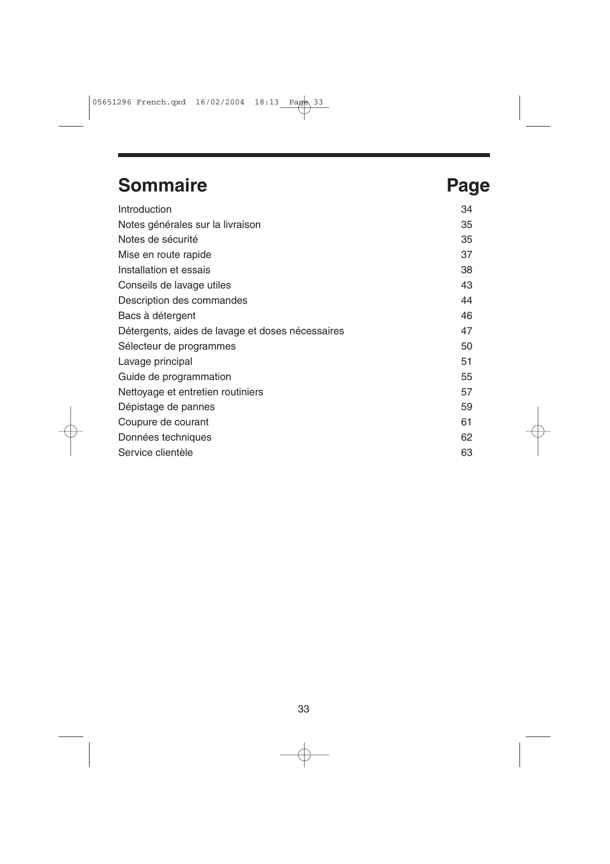 05651296 French.qxd 16/02/2004 18:13 Page 33 Sommaire Page Introduction Notes générales sur la livraison Notes de sécurité Mise en route rapide Installation et essais Conseils de lavage utiles Description des commandes Bacs à détergent Détergents, aides de lavage et doses nécessaires Sélecteur de programmes Lavage principal Guide de programmation Nettoyage et entretien routiniers Dépistage de pannes Coupure de courant Données techniques Service clientèle