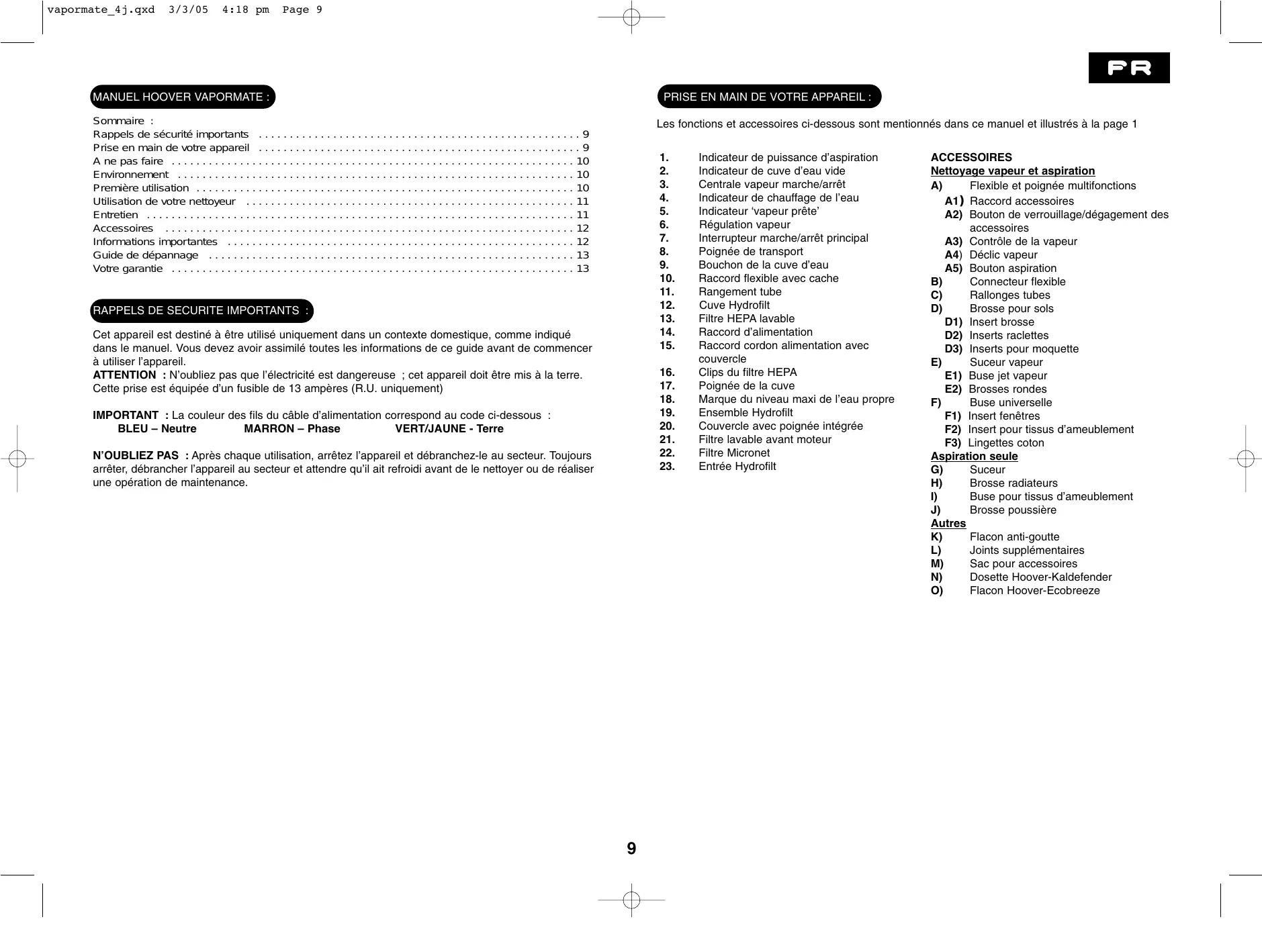 ACCESSOIRES Nettoyage vapeur et aspiration A) Flexible et poignée multifonctions A1) Raccord accessoires A2) Bouton de verrouillage/dégagement des accessoires A3) Contrôle de la vapeur A4) Déclic vapeur A5) Bouton aspiration B) Connecteur flexible C) Rallonges tubes D) Brosse pour sols Di) Insert brosse D2) Inserts raclettes D3) Inserts pour moquette E) Suceur vapeur E1) Buse jet vapeur E2) Brosses rondes F) Buse universelle F1) Insert fenêtres F2) Insert pour tissus d'ameublement F3) Lingettes coton G) Suceur H) Brosse radiateurs i] Buse pour tissus d'ameublement J) Brosse poussière Autres K) Flacon anti-goutte L) Joints supplémentaires M) Sac pour accessoires N) Dosette Hoover-Kaldefender O0) Flacon Hoover-Ecobreeze