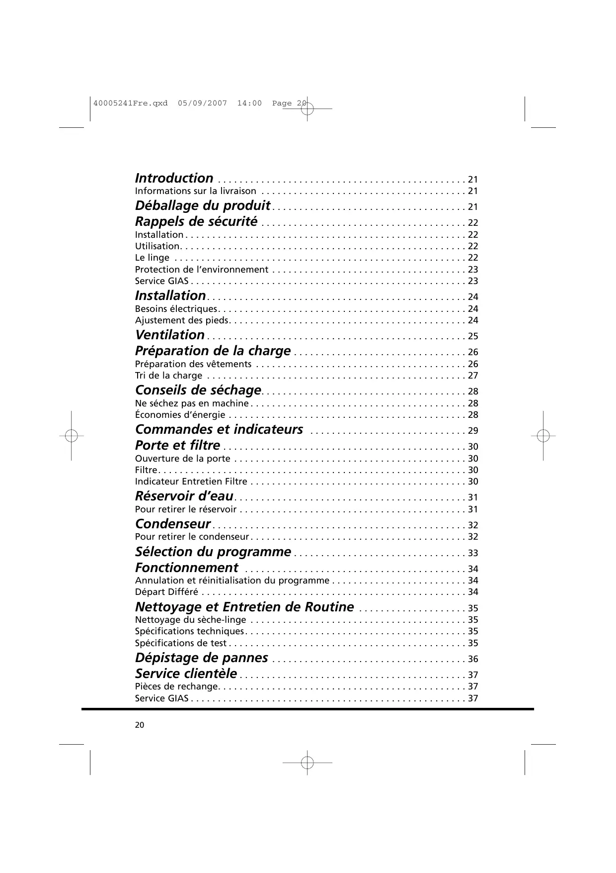 40005241Fre.qxd 05/09/2007 14:00 Page 20 Introduction . . . . . . . . . . . . . . . . . . . . . . . . . . . . . . . . . . . . . . . . . . . . . . 21 Informations sur la livraison . . . . . . . . . . . . . . . . . . . . . . . . . . . . . . . . . . . . . . 21 Déballage du produit . . . . . . . . . . . . . . . . . . . . . . . . . . . . . . . . . . . . 21 Rappels de sécurité . . . . . . . . . . . . . . . . . . . . . . . . . . . . . . . . . . . . . . 22 Installation . . . . . . . . . . . . . . . . Utilisation. . . . . . . . . . . . . . . . . Le linge . . . . . . . . . . . . . . . . . . Protection de l’environnement Service GIAS . . . . . . . . . . . . . . .