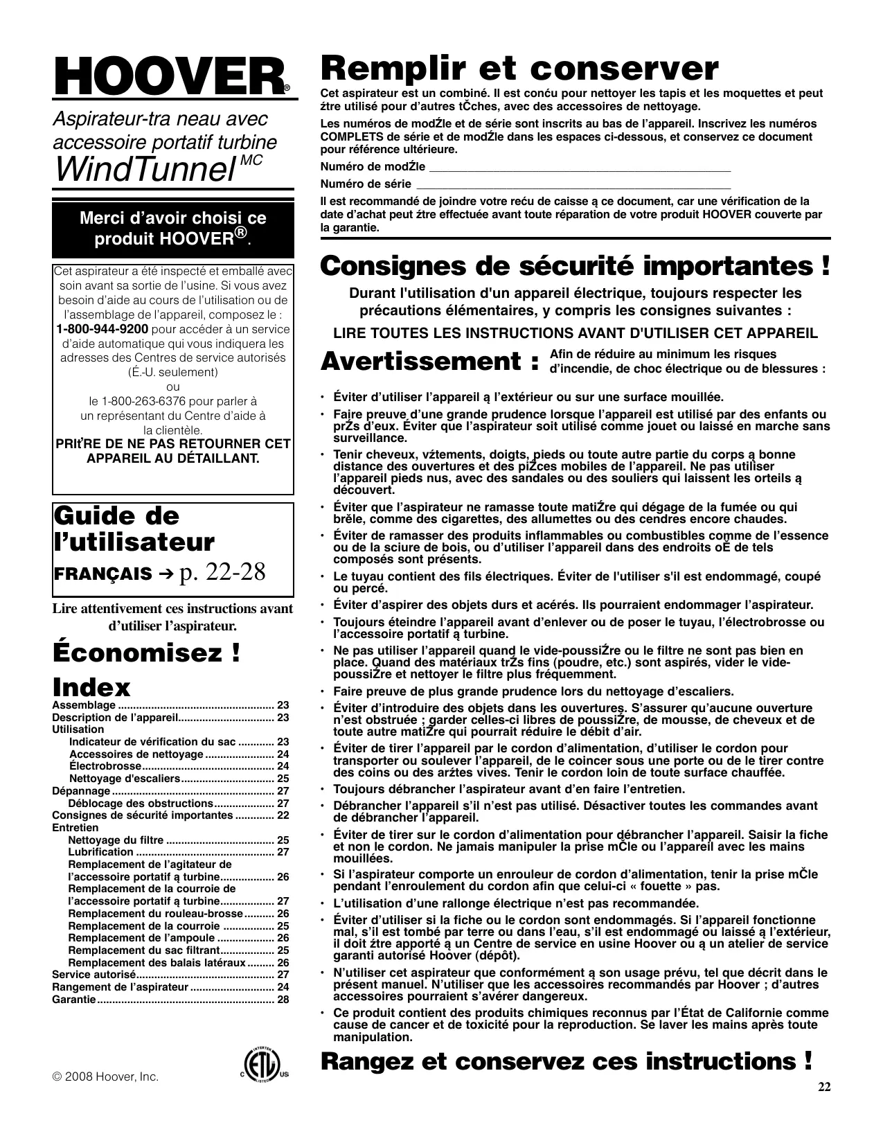 Hoover autorisé (dépôt), chez tous les bons détaillants ou auprès de tous les Centres de service en usine Hoover. 25