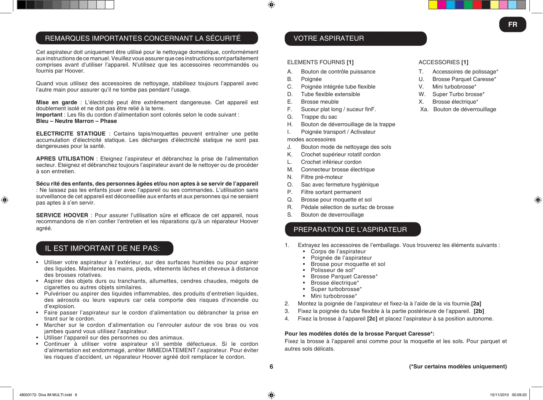 Cet aspirateur doit uniquement être utilisé pour le nettoyage domestique, conformément aux instructions de ce manuel. Veuillez vous assurer que ces instructions sont parfaitement comprises avant d’utiliser l’appareil. N’utilisez que les accessoires recommandés ou fournis par Hoover. Quand vous utilisez des accessoires de nettoyage, stabilisez toujours l’appareil avec l’autre main pour assurer qu’il ne tombe pas pendant l’usage. Mise en garde : L’électricité peut être extrêmement dangereuse. Cet appareil est doublement isolé et ne doit pas être relié à la terre. Important : Les fils du cordon d’alimentation sont colorés selon le code suivant : Bleu – Neutre Marron – Phase ELECTRICITE STATIQUE : Certains tapis/moquettes peuvent entraîner une petite accumulation d’électricité statique. Les décharges d’électricité statique ne sont pas dangereuses pour la santé. APRES UTILISATION : Eteignez l’aspirateur et débranchez la prise de l’alimentation secteur. Eteignez et débranchez toujours l’aspirateur avant de le nettoyer ou de procéder à son entretien. Sécu rité des enfants, des personnes âgées et/ou non aptes à se servir de l’appareil : Ne laissez pas les enfants jouer avec l’appareil ou ses commandes. L’utilisation sans surveillance de cet appareil est déconseillée aux enfants et aux personnes qui ne seraient pas aptes à s’en servir. SERVICE HOOVER : Pour assurer l’utilisation sûre et efficace de cet appareil, nous recommandons de n’en confier l’entretien et les réparations qu’à un réparateur Hoover agréé.