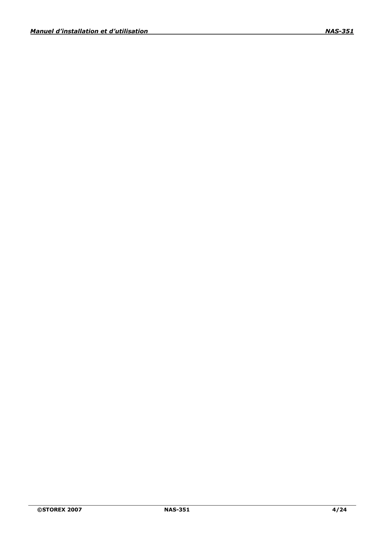 Une preuve d’achat doit être fournie à nos services pour mettre en oeuvre la garantie auprès de STOREX. La garantie ne peut pas s’exercer sur les pannes ou défauts dus à une utilisation non conforme aux recommandations contenues dans cette notice, négligence, transformation, mauvaise installation ou manutention, réparation ou modification non autorisée par STOREX, test inapproprié, accident ou facteur externe comme par exemple, sans s’y limiter, une chaleur ou une humidité excessive, une panne de courant, ou une installation ou désinstallation incorrecte de NAS-351. La seule obligation contractuelle de STOREX consiste en la réparation ou le remplacement du produit défectueux. En aucun cas STOREX ne peut être tenu responsable des pertes de données, ou de ses conséquences, consécutives à un défaut de fonctionnement ou à une panne du produit. En tout état de cause, la responsabilité financière de STOREX ne pourra pas être engagée pour un montant supérieur à la valeur d'acquisition du produit par le client final. La présente garantie de votre NAS-351 est ainsi définie dans ce document et ne pourra pas être modifiée, diminuée ou élargie sans accord écrit de STOREX, et STOREX ne pourra pas être tenu responsable de tout conseil technique ou service fourni en relation avec votre NAS-351. Vous n’êtes pas cessionnaire de la présente garantie. Cette garantie ne couvre uniquement que votre NAS-351, et elle est régie par le droit français. Remarque : STOREX™ se réserve le droit de modifier sans préavis le manuel d’utilisation en fonction des évolutions du produit. Retrouvez la dernière version du manuel sur notre site Web : http://www.storex.eu