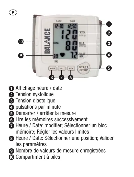Affichage heure / date Tension systolique Tension diastolique pulsations par minute Démarrer / arrêter la mesure Lire les mémoires successivement Heure / Date: modifier; Sélectionner un bloc mémoire; Régler les valeurs limites Heure / Date: Sélectionner une position; Valider les paramètres Nombre de valeurs de mesure enregistrées Compartiment à piles