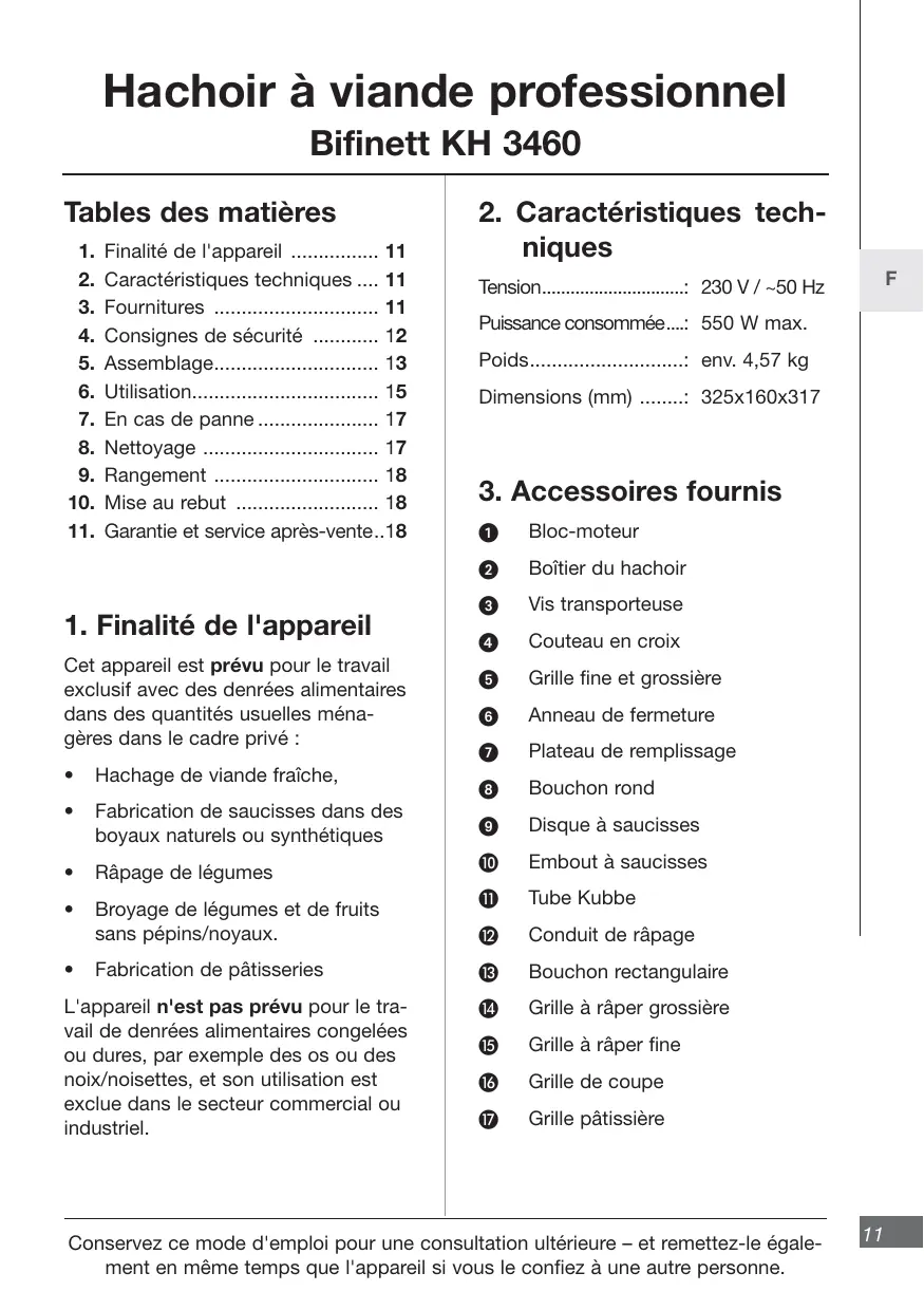 MODE D'EMPLOI BIFINETT KH 3460 HACHOIR A VIANDE PROFESSIONNEL KOMPERNASS
