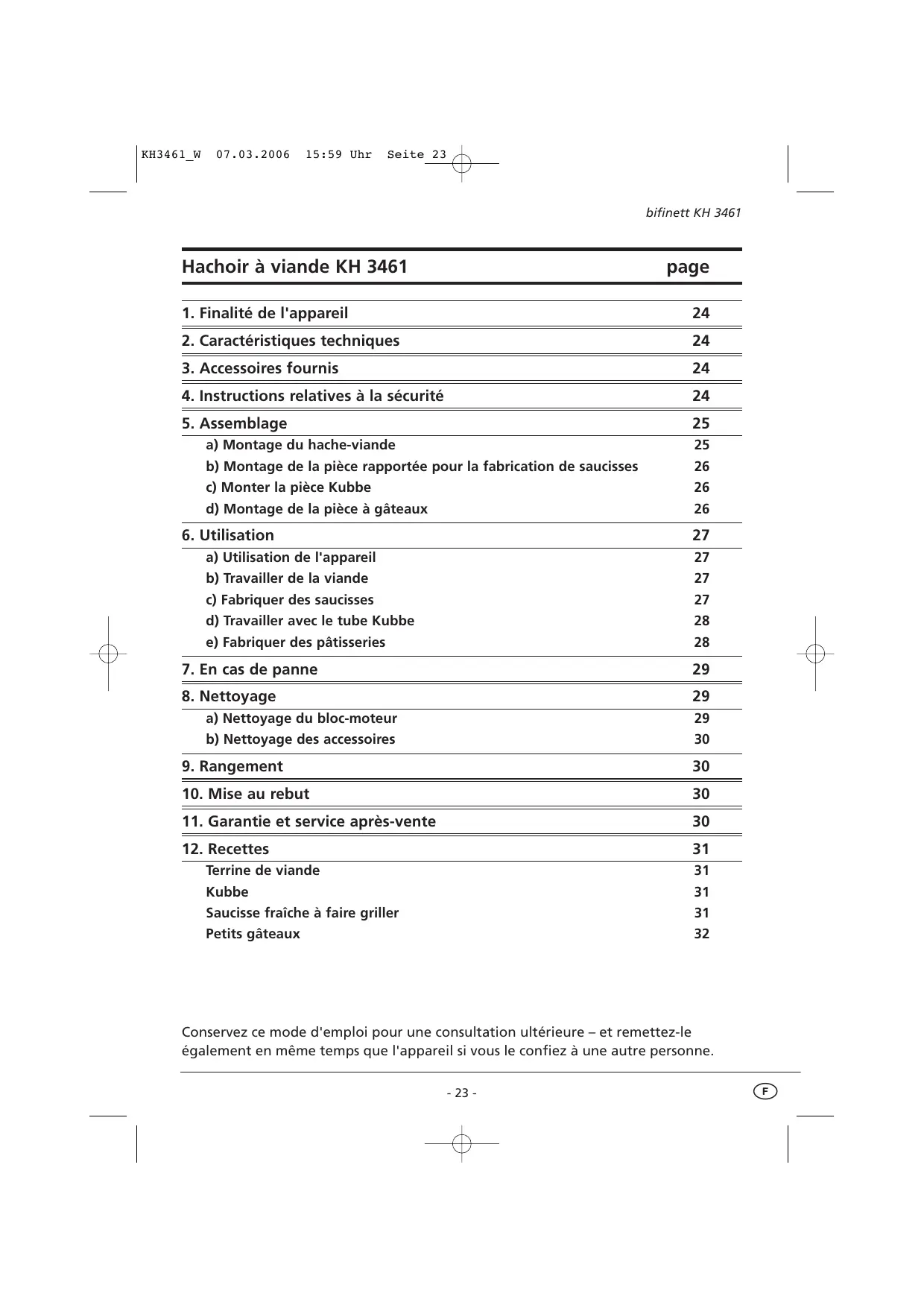 MODE D'EMPLOI BIFINETT KH 3461 HACHOIR A VIANDE PROFESSIONNEL KOMPERNASS