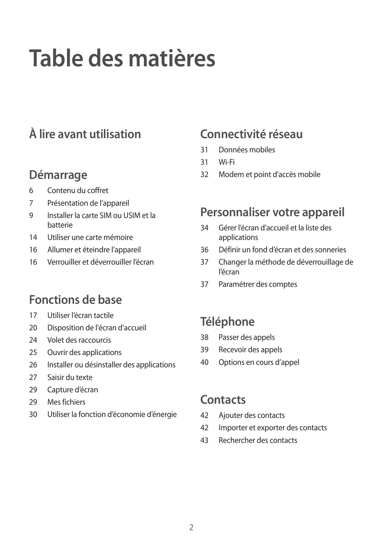 Contenu du coffret Présentation de l’appareil Installer la carte SIM ou USIM et la batterie Utiliser une carte mémoire Allumer et éteindre l’appareil Verrouiller et déverrouiller l’écran