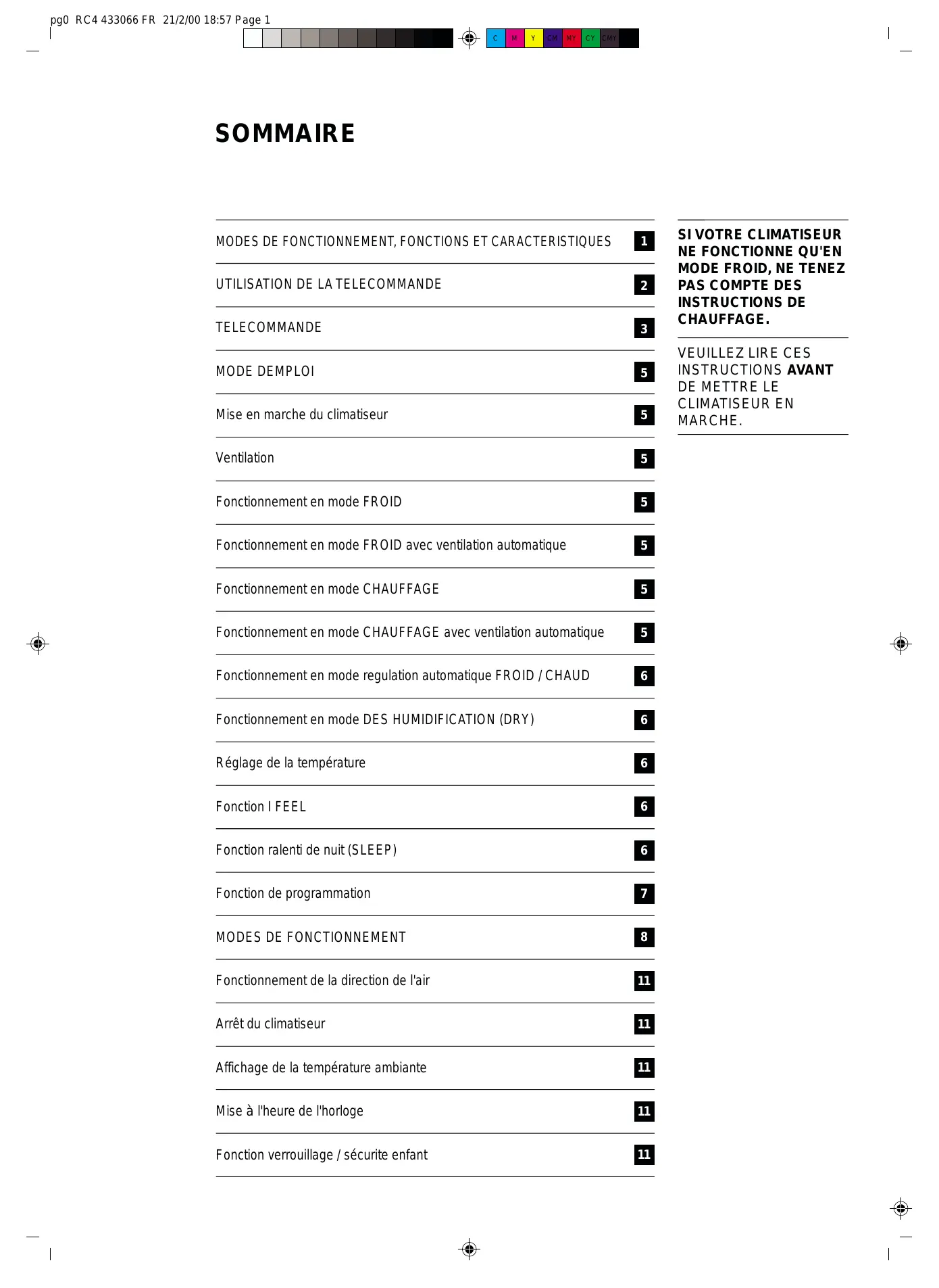 EN SERVICE Avant de mettre le climatiseur en marche, vérifier : ● que la languette rouge protégeant la pile de la télécommande a bien été retirée. ● Pour la mise à l'heure de l'horloge, voir page 11.