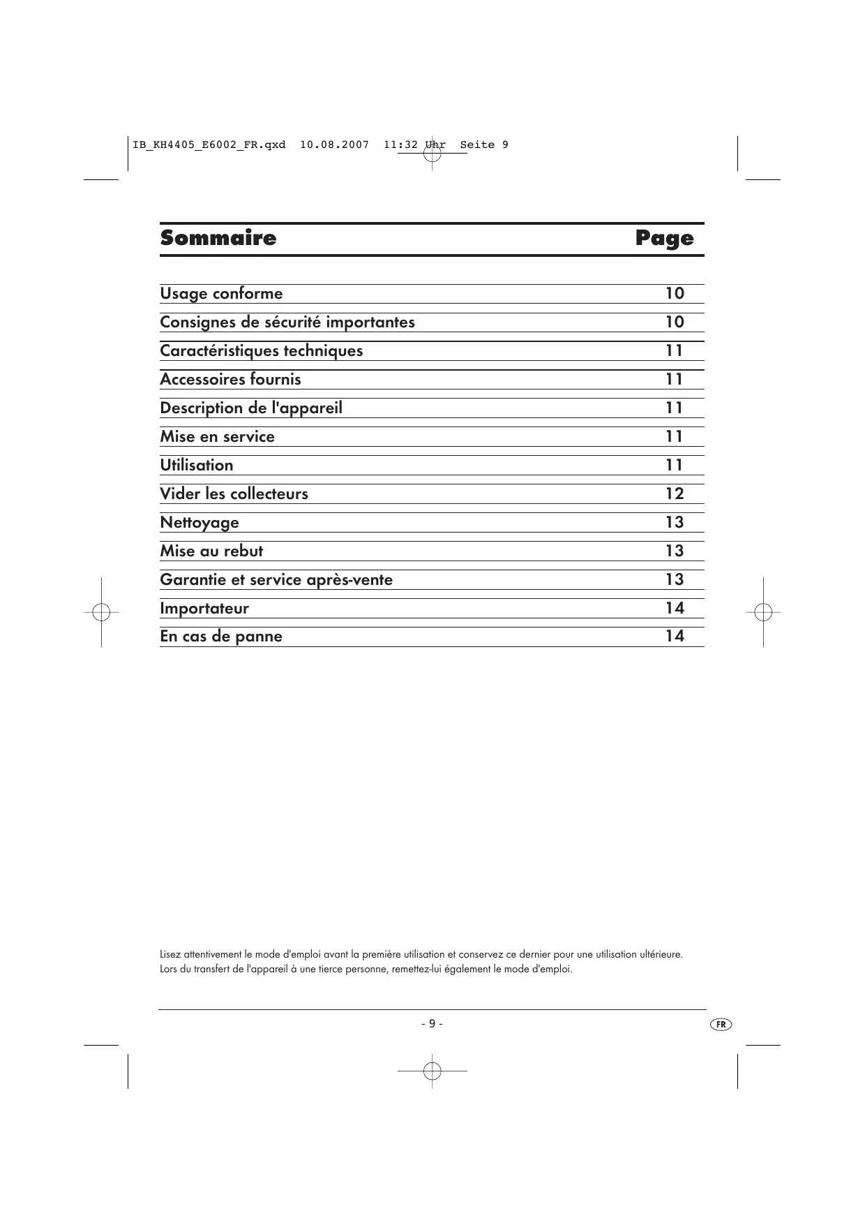 Seite 13 Garantie et service après-vente Danger ! Débranchez la fiche secteur avant chaque nettoyage. Risque d'électrocution ! Cet appareil bénéficie de 3 ans de garantie à compter de la date d'achat. L'appareil a été fabriqué avec soin et consciencieusement contrôlé avant sa distribution. Veuillez conserver le ticket de caisse en guise de preuve d'achat. Dans le cas où la garantie s'applique, veuillez appeler le service après-vente compétent. Cette condition doit être respectée pour assurer l'expédition gratuite de votre marchandise. Avertissement ! Les lames de l'appareil sont coupantes ! Risque d'accident !