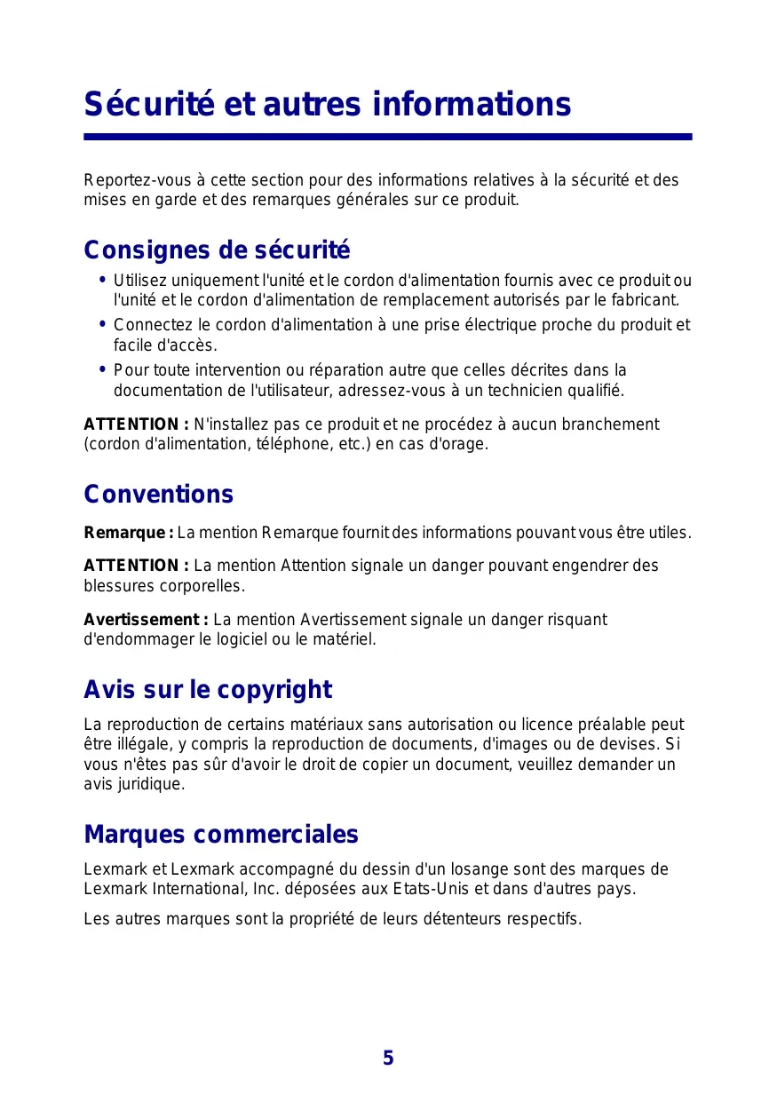 d'endommager le logiciel ou le matériel. Avis sur le copyright La reproduction de certains matériaux sans autorisation ou licence préalable peut être illégale, y compris la reproduction de documents, d'images ou de devises. Si vous n'êtes pas sûr d'avoir le droit de copier un document, veuillez demander un avis juridique. Marques commerciales Lexmark et Lexmark accompagné du dessin d'un losange sont des marques de Lexmark International, Inc. déposées aux Etats-Unis et dans d'autres pays. Les autres marques sont la propriété de leurs détenteurs respectifs.