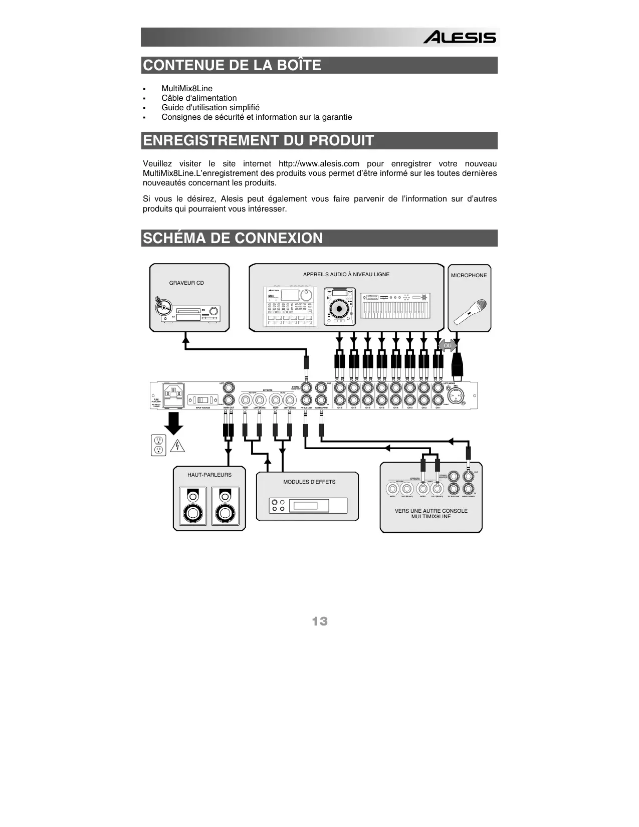 Veuillez visiter le site internet http://www.alesis.com pour enregistrer votre nouveau MultiMix8Line.L’enregistrement des produits vous permet d’être informé sur les toutes dernières nouveautés concernant les produits. Si vous le désirez, Alesis peut également vous faire parvenir de l’information sur d’autres produits qui pourraient vous intéresser. VOLUME Règle le gain de chaque canal.