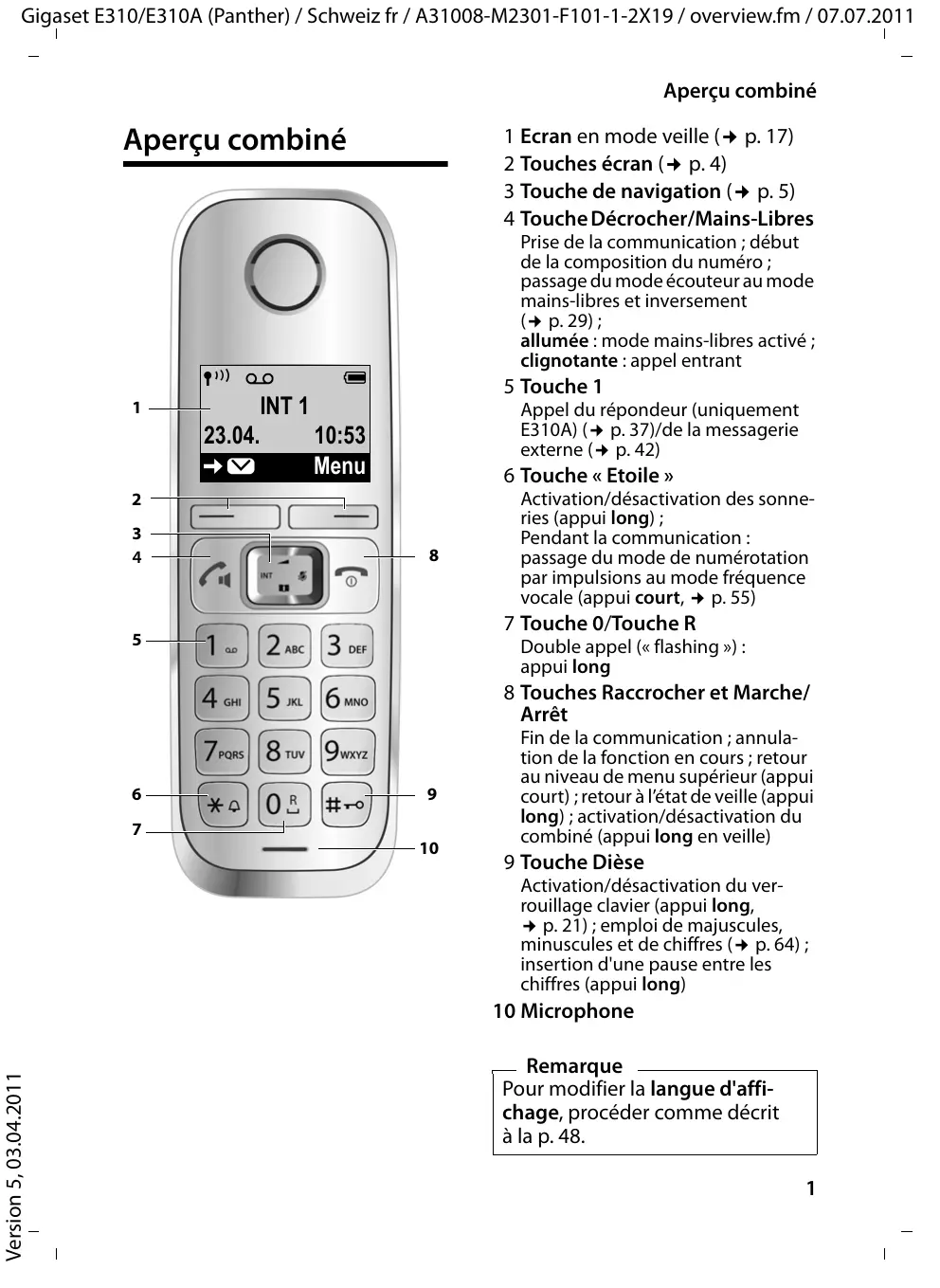 Fin de la communication ; annulation de la fonction en cours ; retour au niveau de menu supérieur (appui court) ; retour à l’état de veille (appui long) ; activation/désactivation du combiné (appui long en veille) 9 Touche Dièse Activation/désactivation du verrouillage clavier (appui long, ¢ p. 21) ; emploi de majuscules, minuscules et de chiffres (¢ p. 64) ; insertion d'une pause entre les chiffres (appui long) Version 5, 03.04.2011 10 Microphone Remarque Pour modifier la langue d'affichage, procéder comme décrit à la p. 48.