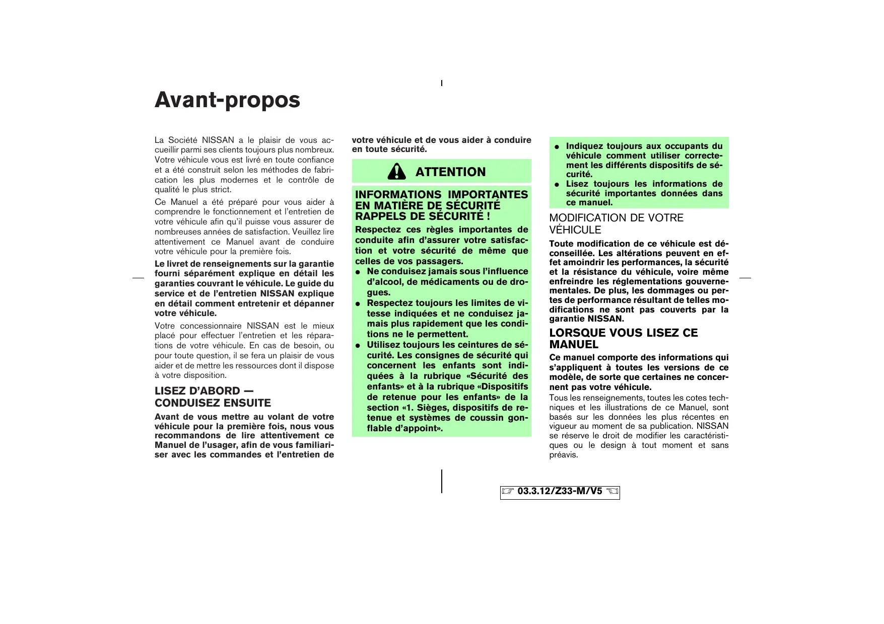 MANUEL Ce manuel comporte des informations qui s’appliquent à toutes les versions de ce modèle, de sorte que certaines ne concernent pas votre véhicule. Tous les renseignements, toutes les cotes techniques et les illustrations de ce Manuel, sont basés sur les données les plus récentes en vigueur au moment de sa publication. NISSAN se réserve le droit de modifier les caractéristiques ou le design à tout moment et sans préavis. 墌 03.3.12/Z33-M/V5 墍 INFORMATIONS IMPORTANTES