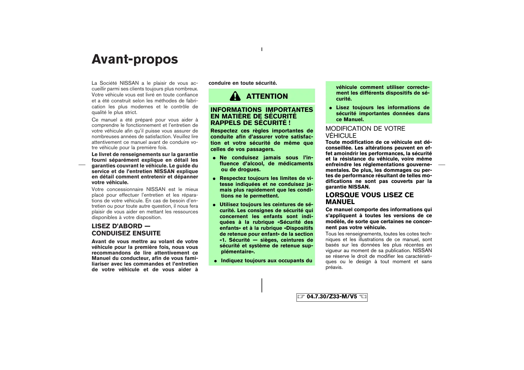Votre véhicule vous est livré en toute confiance et a été construit selon les méthodes de fabrication les plus modernes et le contrôle de qualité le plus strict. Ce manuel a été préparé pour vous aider à comprendre le fonctionnement et l’entretien de votre véhicule afin qu’il puisse vous assurer de nombreuses années de satisfaction. Veuillez lire attentivement ce manuel avant de conduire votre véhicule pour la première fois. Le livret de renseignements sur la garantie fourni séparément explique en détail les garanties couvrant le véhicule. Le guide du service et de l’entretien NISSAN explique en détail comment entretenir et dépanner votre véhicule. Votre concessionnaire NISSAN est le mieux placé pour effectuer l’entretien et les réparations de votre véhicule. En cas de besoin d’entretien ou pour toute autre question, il nous fera plaisir de vous aider en mettant les ressources disponibles à votre disposition.