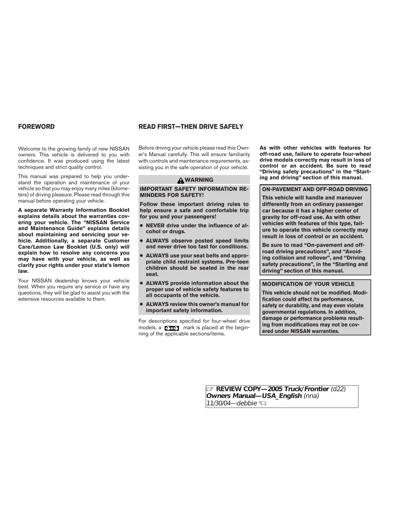 MODE D'EMPLOI FRONTIER 2005 NISSAN