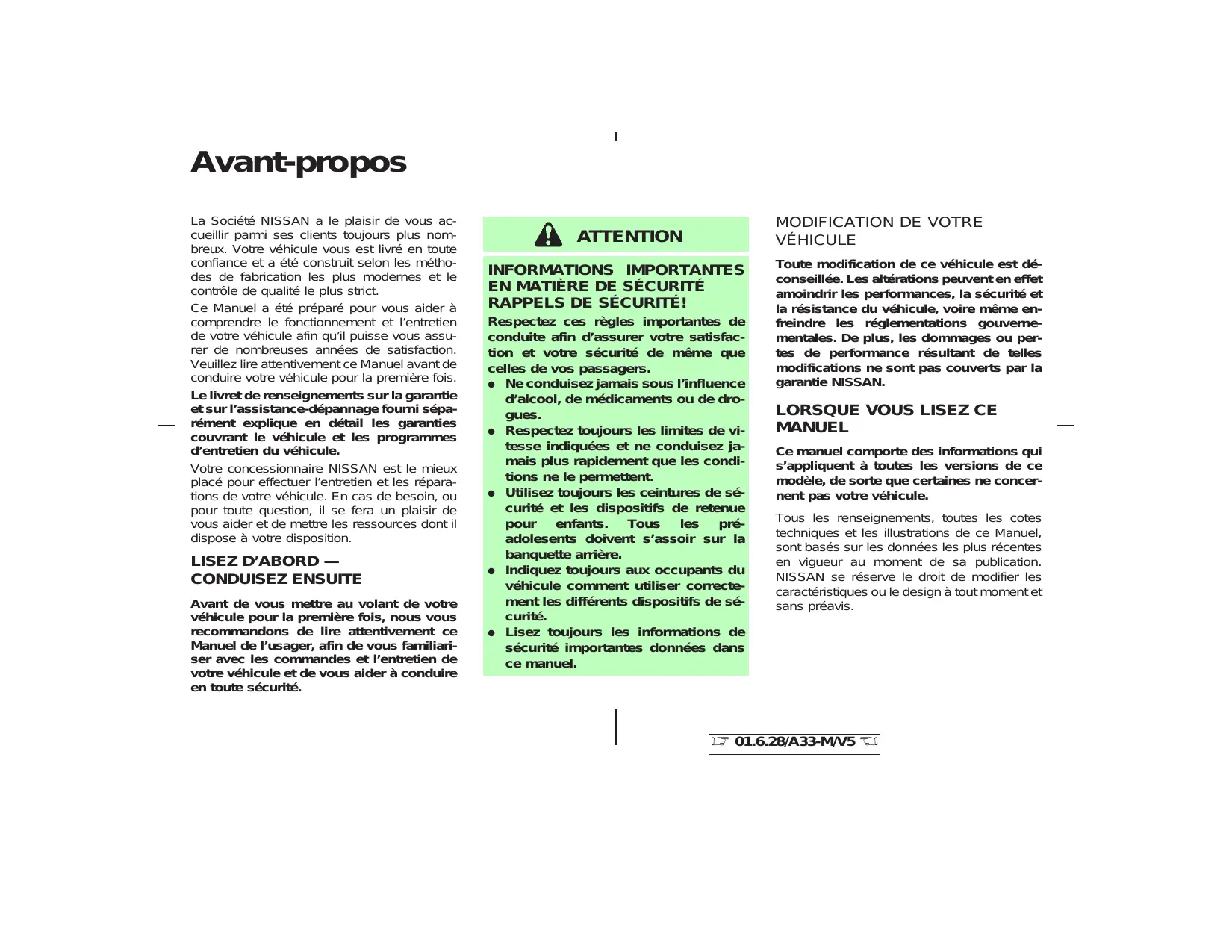 Nous sommes sensibles à l'intérêt que vous portez à NISSAN et vous remercions d'avoir acheté un vehicule de qualite NISSAN.