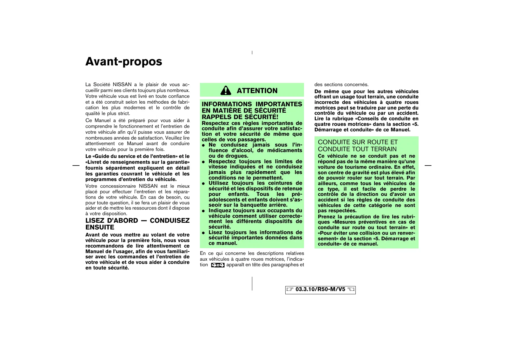 Tous les renseignements, toutes les cotes techniques et les illustrations de ce Manuel, sont basés sur les données les plus récentes en vigueur au moment de sa publication. NISSAN se reserve le droit de modifier les caractéristiques ou le design sans préavis et sans obligation de sa part.