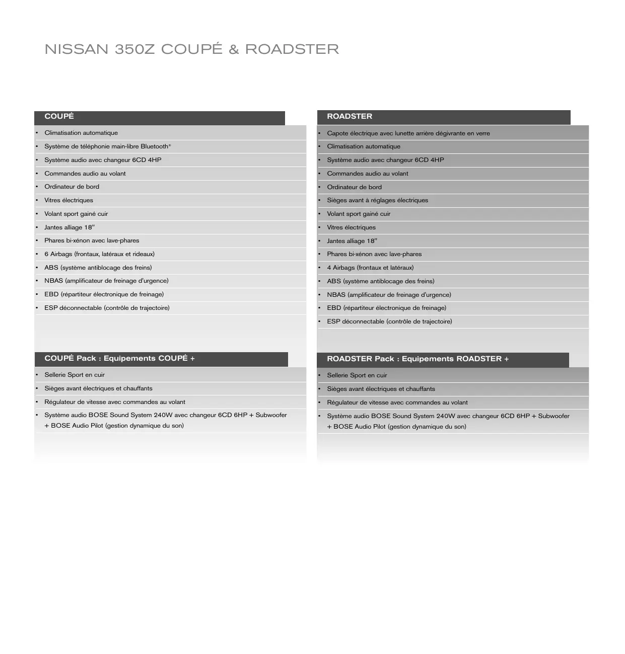 Phares Bi-Xénon avec lave-phares Essuie-glaces avant 2 vitesses et fonction intermittence variable Phares antibrouillard arrière Phares antibrouillard avant Rétroviseur extérieur panoramique côté conducteur Rétroviseurs intérieur (jour/nuit manuel) FICHE TECHNIQUE 350Z COUPÉ 350Z ROADSTER V6 3.5 V6 3.5 ■ MODÈLE