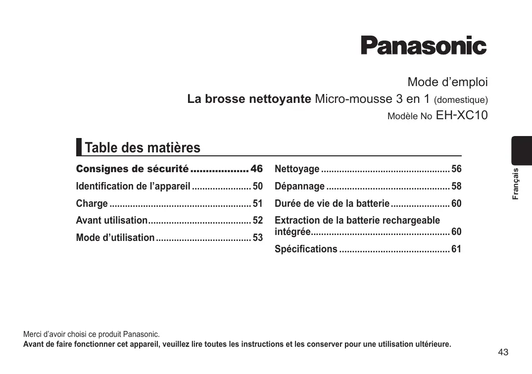 Retrouvez gratuitement la notice de l'appareil EHXC10 PANASONIC au format PDF.